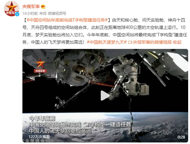 【中国空间站年底前完成T字构型建造任务】由天和核心舱、问天实验舱、神舟十四号、天舟四号组成的空间站组合体,此刻正在距离地球400公里的太空轨道上运行。10月底,梦天实验舱也将加入它们。今年年底前,中国空间站将最终完成“T字构型”建造任务,中国人的飞天梦将更加高远!