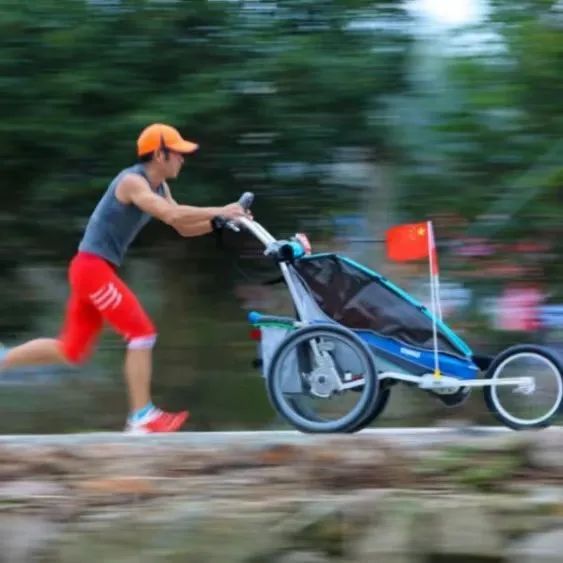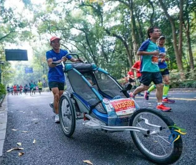 在一场马拉松比赛中,有观赛者拍下了这样的画面:一位身穿运动背心的男子推着一辆四轮推车,推车里安静坐着一个小男孩,他和父亲一起向终点的方向前进。