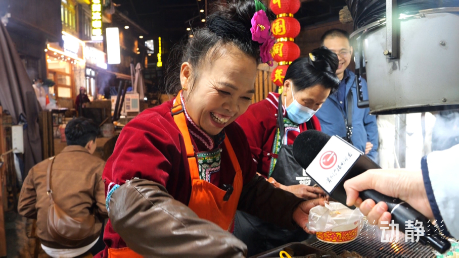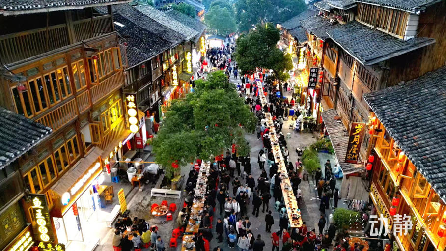 夜幕降临,长桌宴摆满了大半个主街道,游客们与村民共享侗族美食。听村歌、跳篝火、看一场烟花秀,庆祝活动多彩纷呈,仅11月30号一天,肇兴侗寨就接待了超过2万名游客。