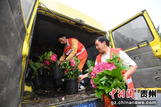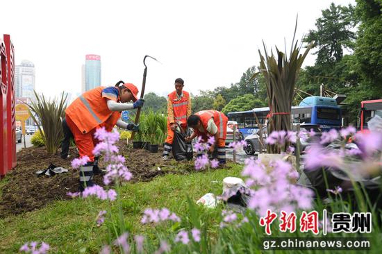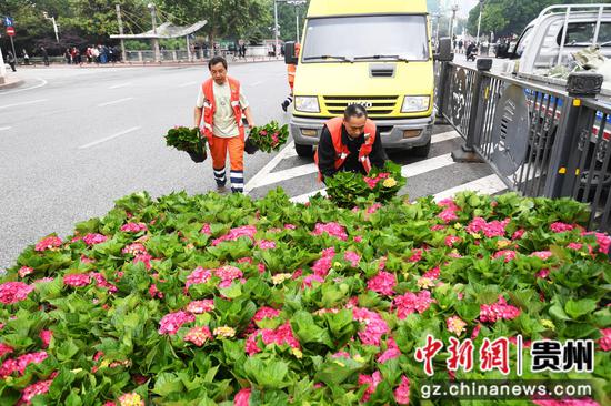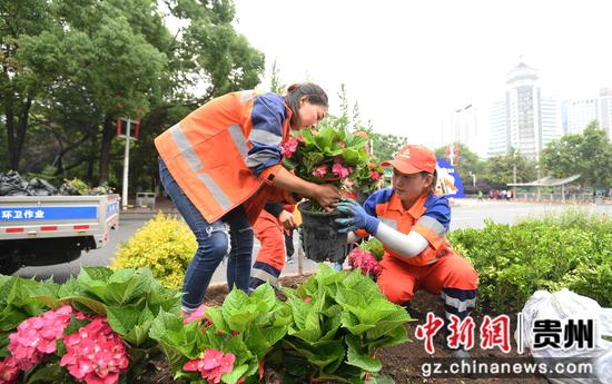 5月15日,在贵阳市南明区遵义路(筑城广场段)两处端头,园林工人正在栽种绣球、月季等花卉,迎接2024年“5·19中国旅游日”主题周倒计时城市接力(贵阳)活动。