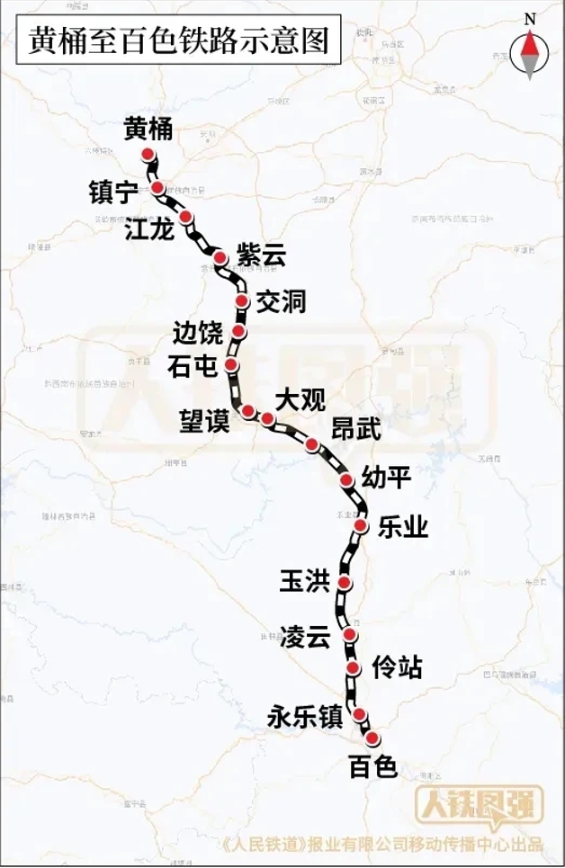 黄百铁路位于贵州、广西境内,全长约315公里,设计时速160公里,为国家Ⅰ级单线电气化铁路,线路起自贵州省安顺市普定县黄桶站,途经贵州省安顺市镇宁布依族苗族自治县、紫云苗族布依族自治县,黔西南布依族苗族自治州望谟县及广西壮族自治区百色市乐业县、凌云县,接入百色站。黄百铁路广西段新建隧道33座、总长109.735公里,新建桥梁33座、总长15.974公里,桥隧比高达90.6%。