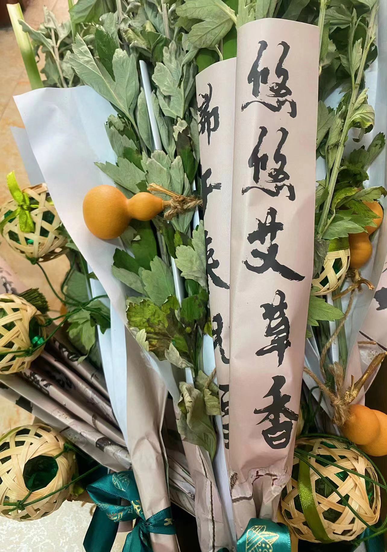 祈福祝愿的香包内装着晒干的艾草,寓意辟邪驱浊,保护平安;葫芦则寓意吉祥、幸福和财富。这个手工制作的特殊礼品,传承了中国几千年的文化。