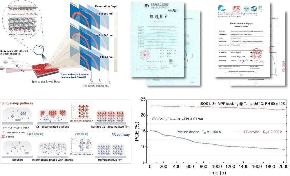 针对这一难题,袁明鉴带领研究团队结合理论预测,发展了一种具有更高热稳定性的合金钙钛矿制备策略,该策略彻底解决甲脒铯组分钙钛矿薄膜组分不均一的问题。利用该策略制备的钙钛矿太阳能电池器件,展现出世界一流的能量转换效率与高温工况稳定性。