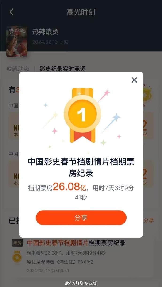 据灯塔专业版,影片《热辣滚烫》春节档期票房达26.08亿,超过影片《满江红》,打破影史春节档剧情片档期票房纪录!