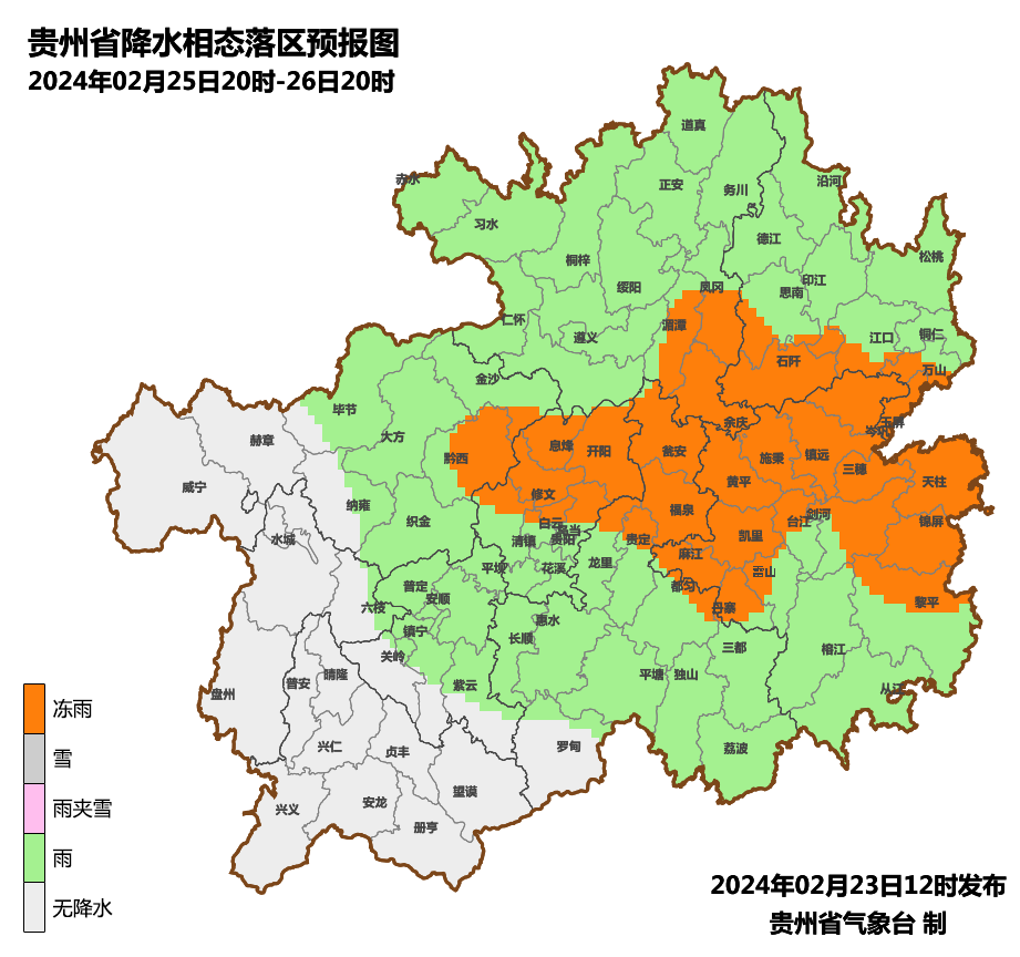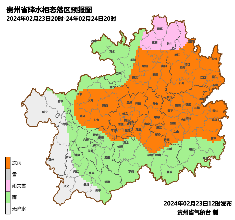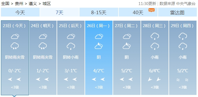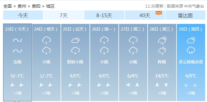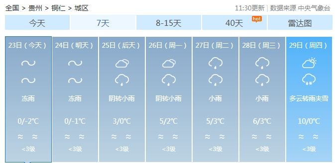 今天夜间到明天白天,省的西部边缘地区夜间阴天,白天阴天转多云,其余地区阴天夜间到早晨有小雨,遵义市中东部、铜仁市、黔东南州中北部、黔南州中北部、毕节市东部、贵阳市、安顺市北部有冻雨或小雨夹雪;