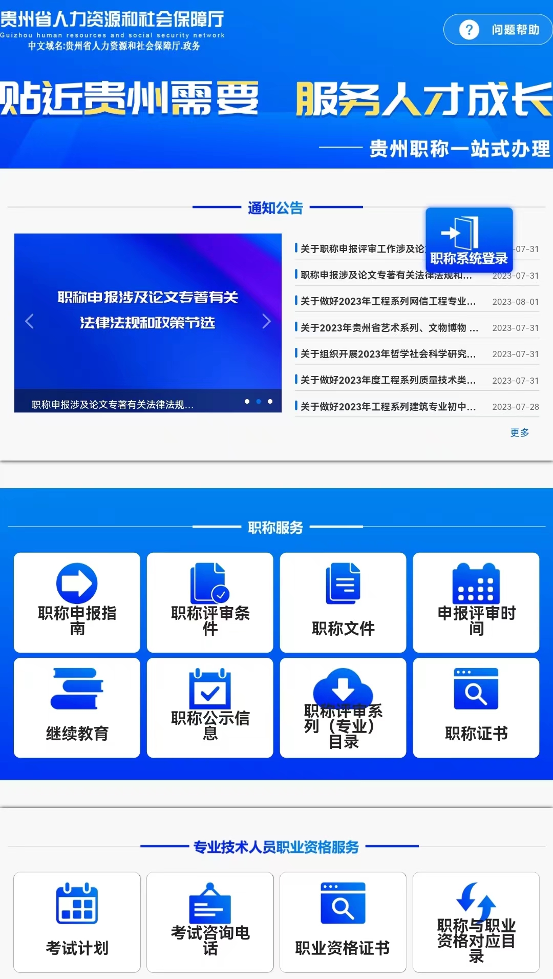 或登录“贵州省人才人事公共服务平台”,在首页选择“贵州职称一站式办理专栏”点击进入。