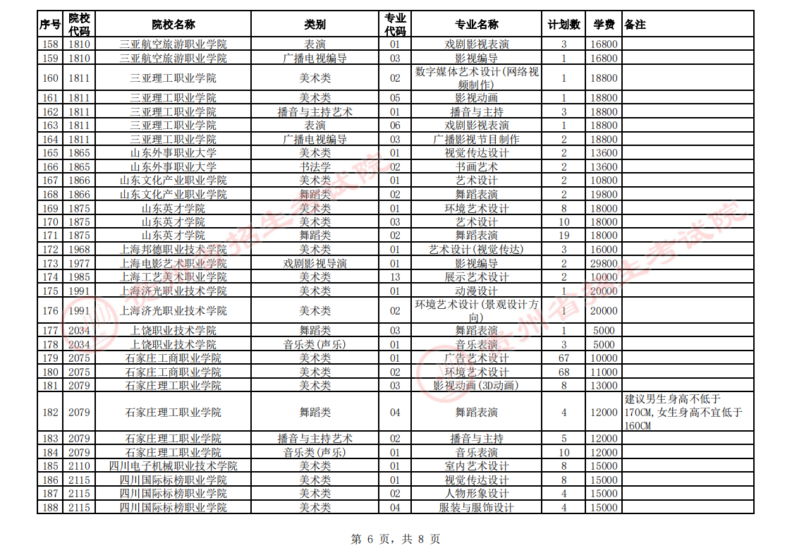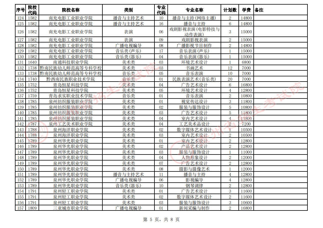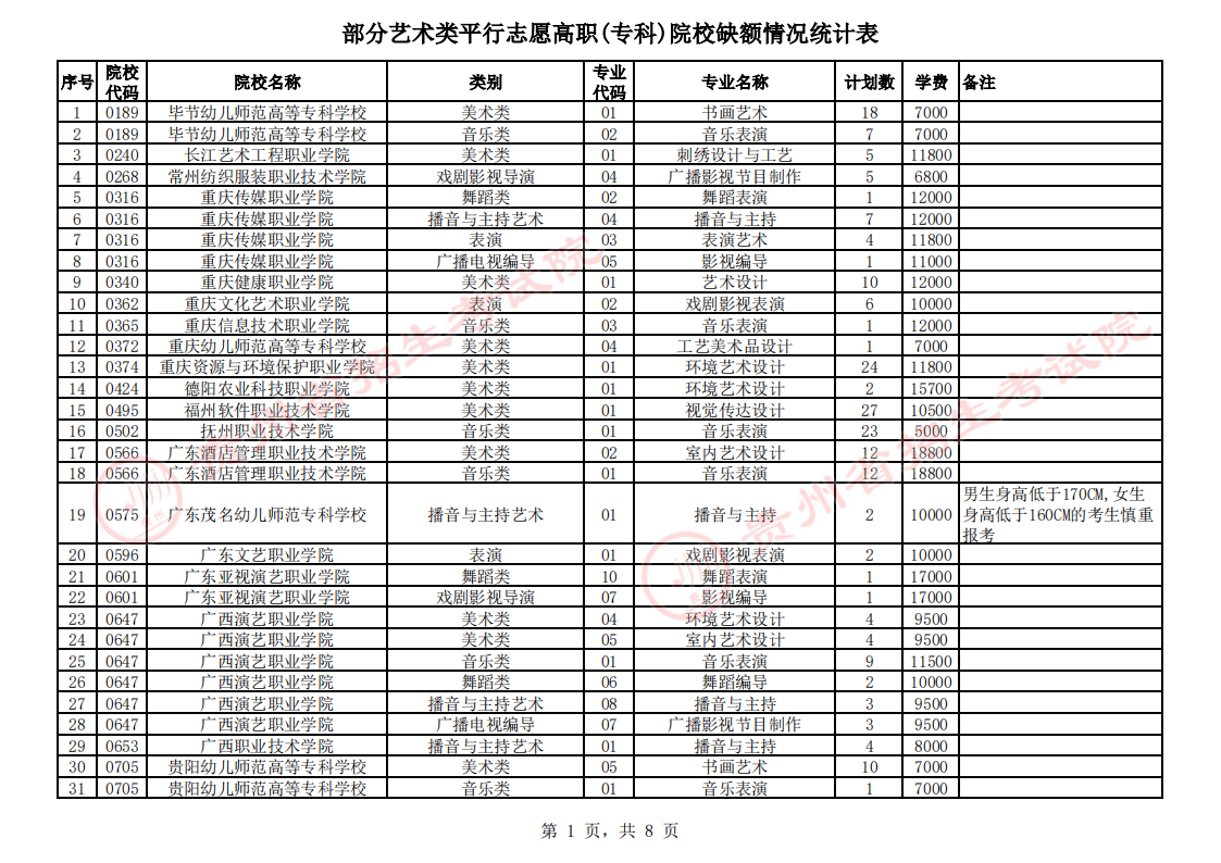 附:部分艺术类平行志愿高职(专科)院校缺额情况统计表