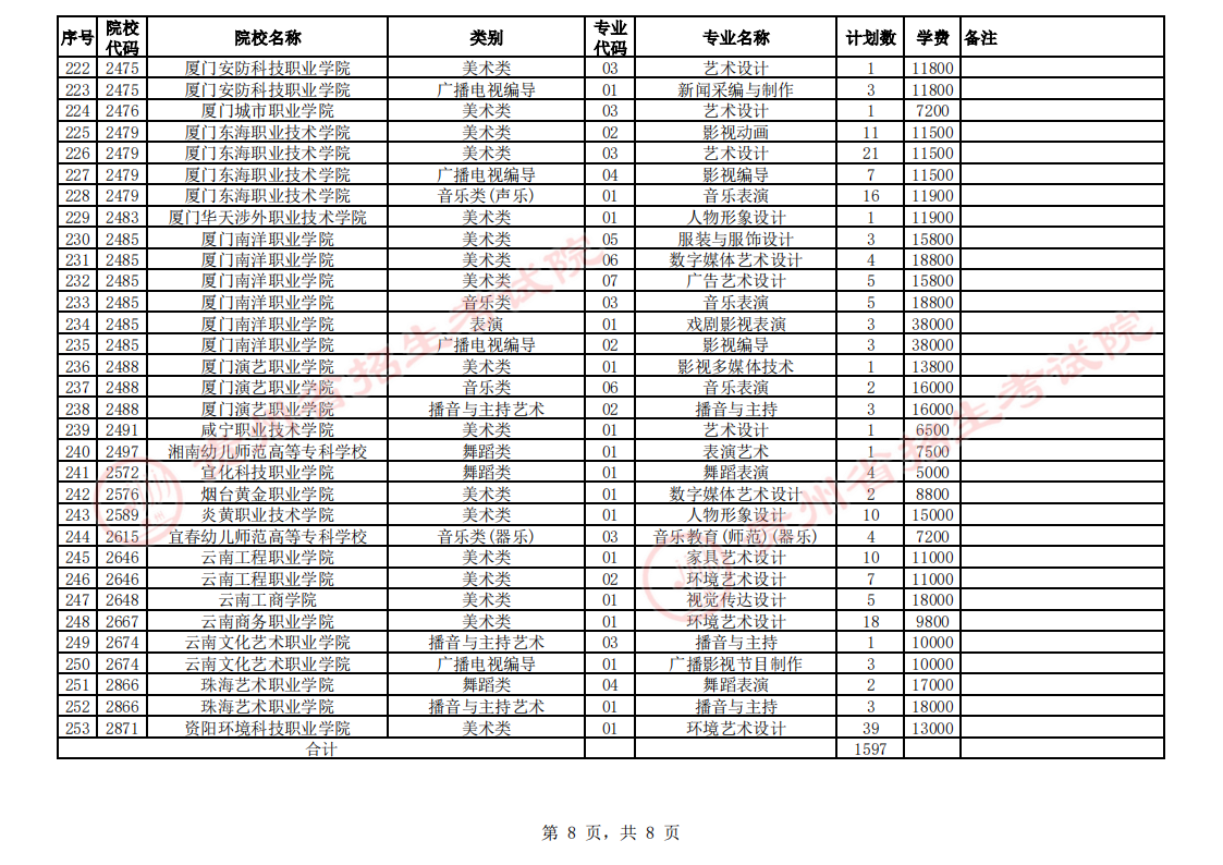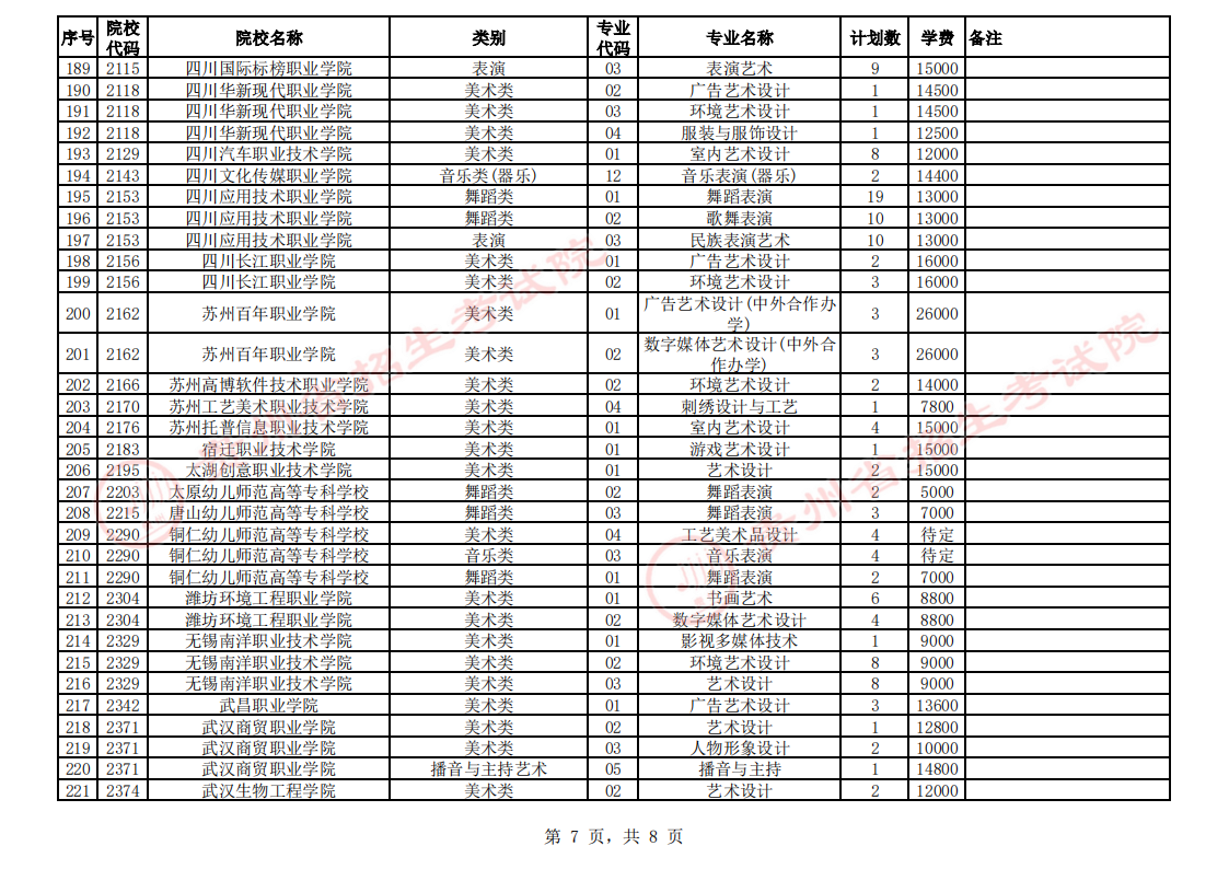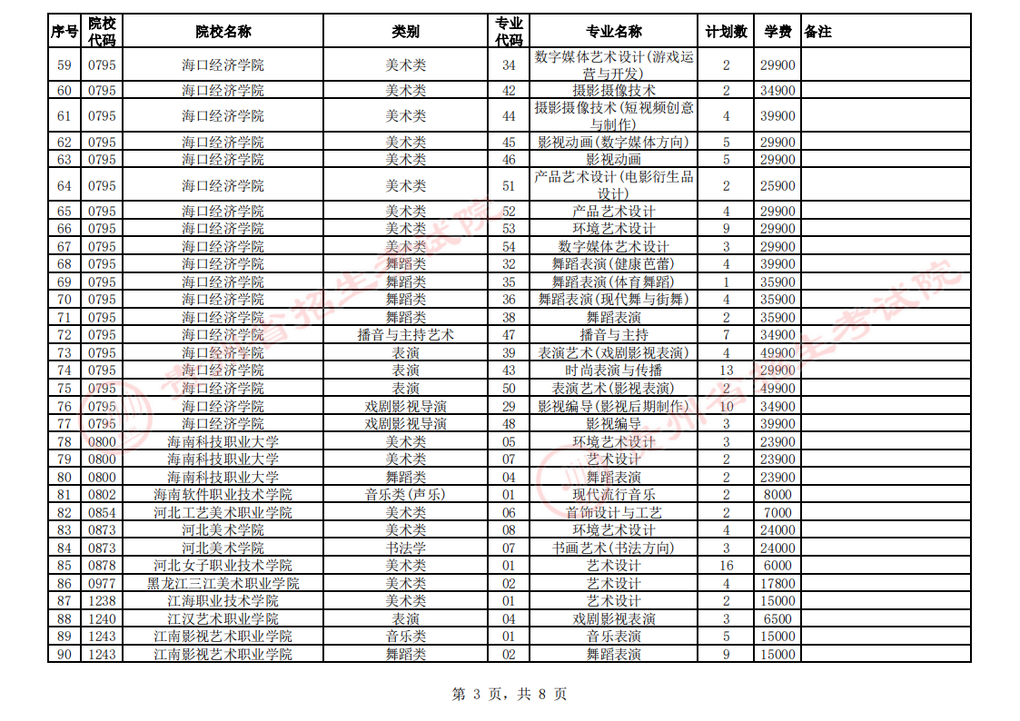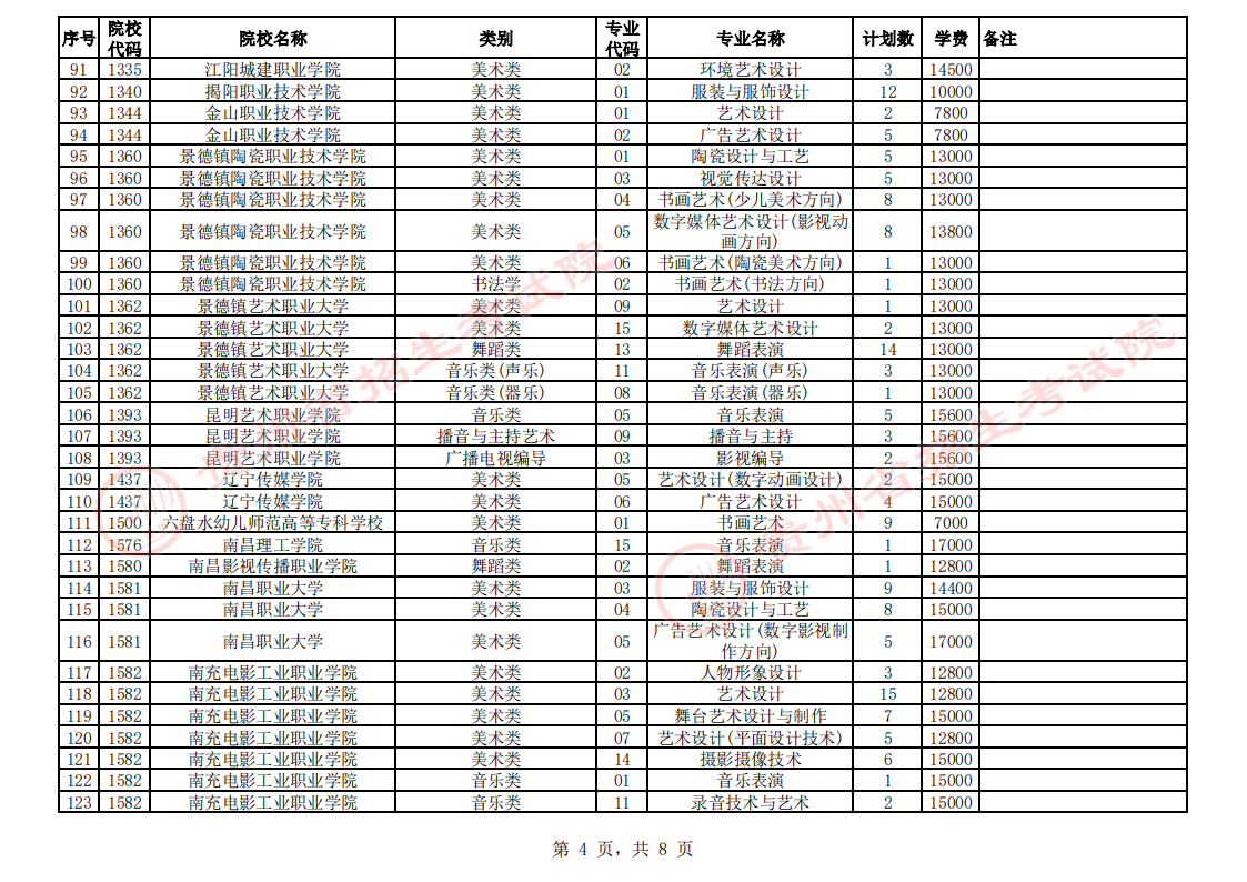 附:部分艺术类平行志愿高职(专科)院校缺额情况统计表