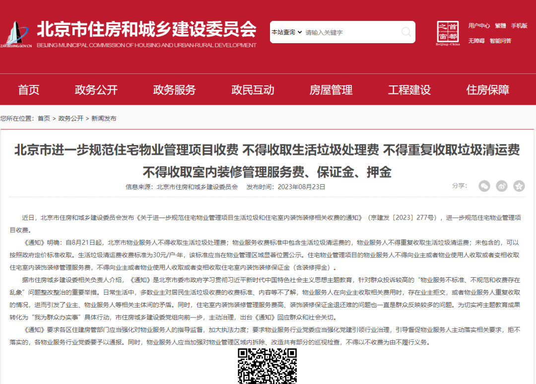 北京市住房城乡建设委近日发布《关于进一步规范住宅物业管理项目生活垃圾和住宅室内装饰装修相关收费的通知》,要求北京市物业服务人不得收取生活垃圾处理费,不得向业主或者物业使用人收取室内装饰装修管理服务费及保证金(含装修押金),进一步规范住宅物业管理项目收费。