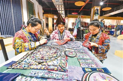在苗族聚居的贵州,近年来将这一文化瑰宝作为产业大力推动发展,妇女们背着娃、绣着花、养活自己养活家,不仅用一针一线“绣”出美好生活,还将蕴藏着古老文化的苗绣巧妙融入时尚元素,形成产业融合互动。如今,古老的苗绣日益走进大众生活,焕发蓬勃生机。