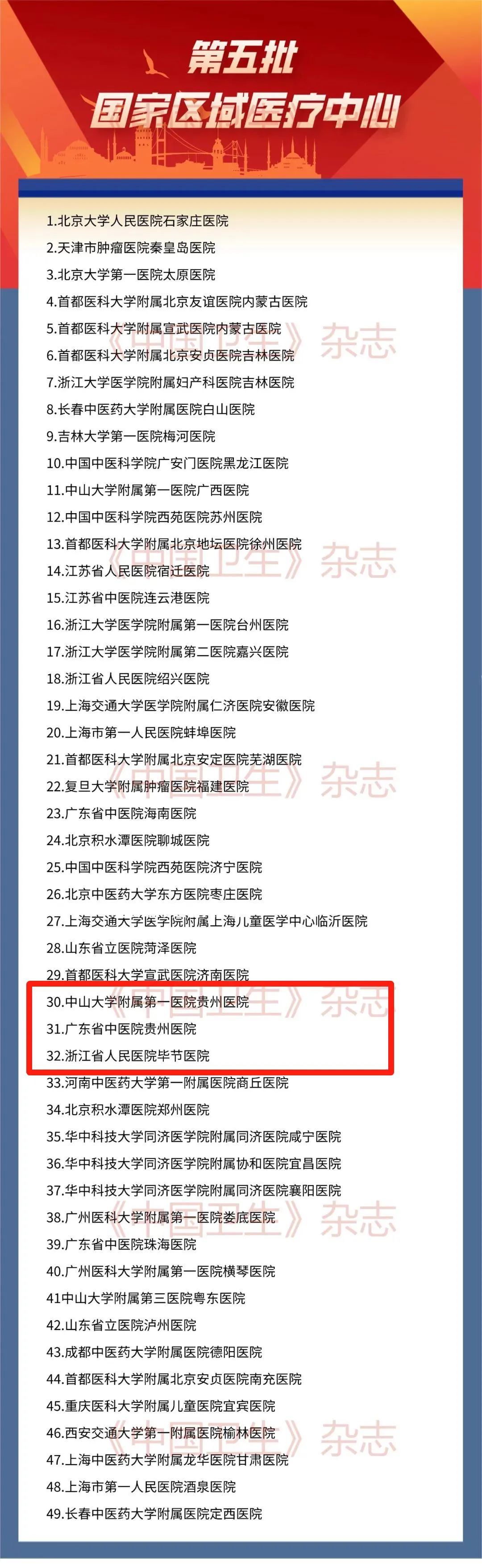 日前,国家发展改革委办公厅、国家卫生健康委办公厅、国家中医药管理局综合司印发《第五批国家区域医疗中心项目名单》,49家医院获批,贵州省三家医院在列,分别是:中山大学附属第一医院贵州医院、广东省中医院贵州医院、浙江省人民医院毕节医院。具体名单如下↓