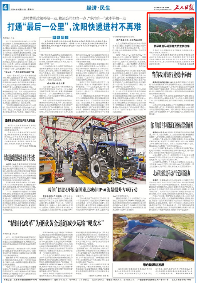 今天(8月22日),《工人日报》刊发新闻《贵平高速马场河特大桥主拱合龙》。