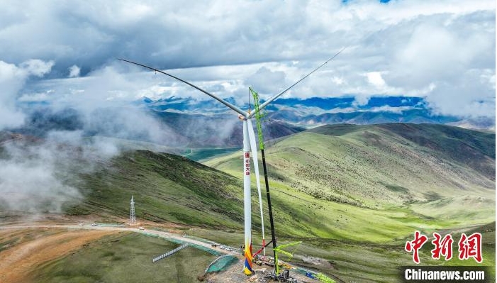 7月10日,在海拔5200米的藏东南高原,1800吨汽车吊将重达117吨的风机叶轮组件缓缓吊至110米高空,与机舱精准对接。这标志着世界在建最高海拔风电场——大唐西藏能源开发有限公司八宿100兆瓦保障性并网风电项目首台风机吊装完成。