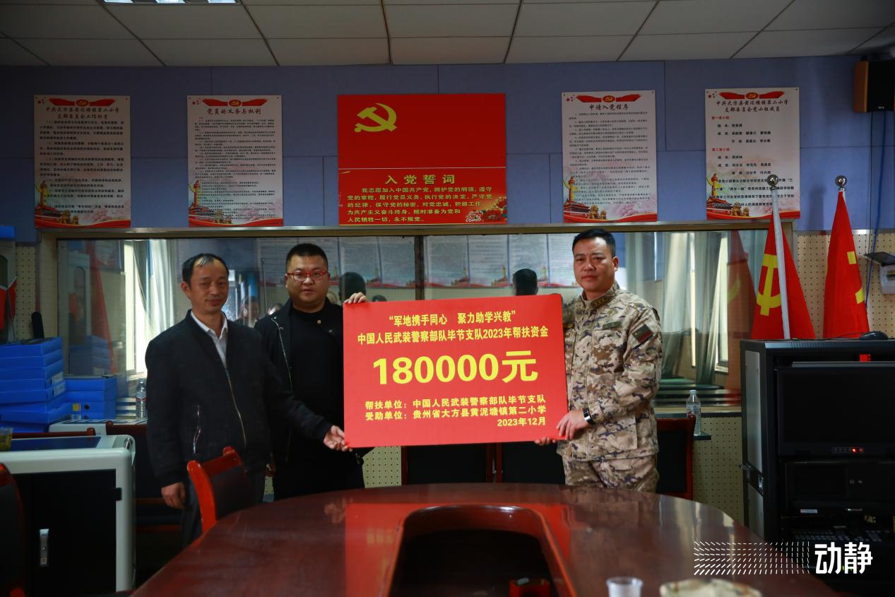 近日,武警贵州总队毕节支队乡村振兴小组先后来到大方县猫场镇联合村、纳雍县化作乡枪杆岩村、大方县黄泥塘镇第二小学等帮扶村校开展实地调研,捐赠帮扶资金近40万元,进一步深化乡村振兴成果。