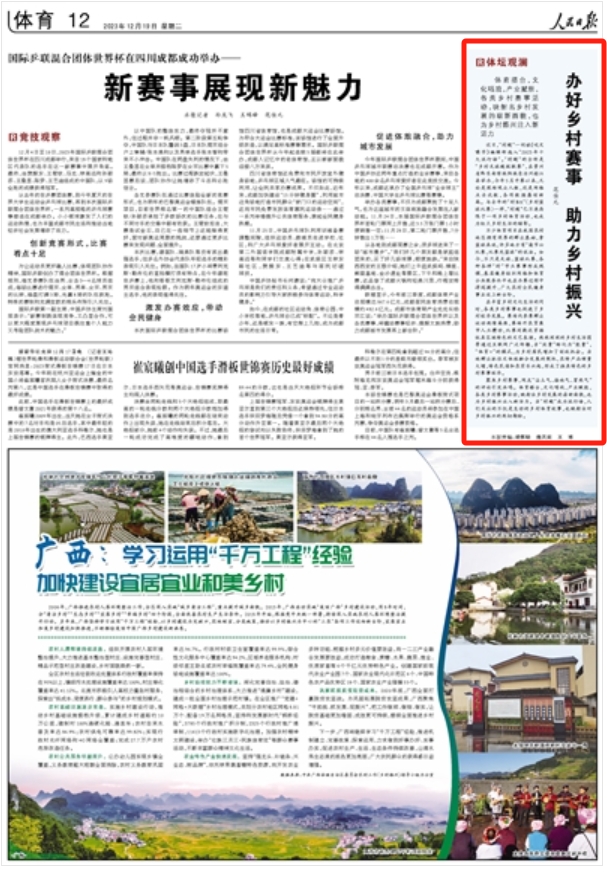 不少体育项目在我国农村地区拥有深厚的群众基础,拿篮球来说,许多地方有“逢节必比赛,比赛先篮球”的说法。如今,不只是足球、篮球比赛,各种各样“村”字头赛事形成规模,基层健身组织网络和体育公共服务水平也在办赛过程中得到提升,广大农村全民健身事业迈上新台阶。