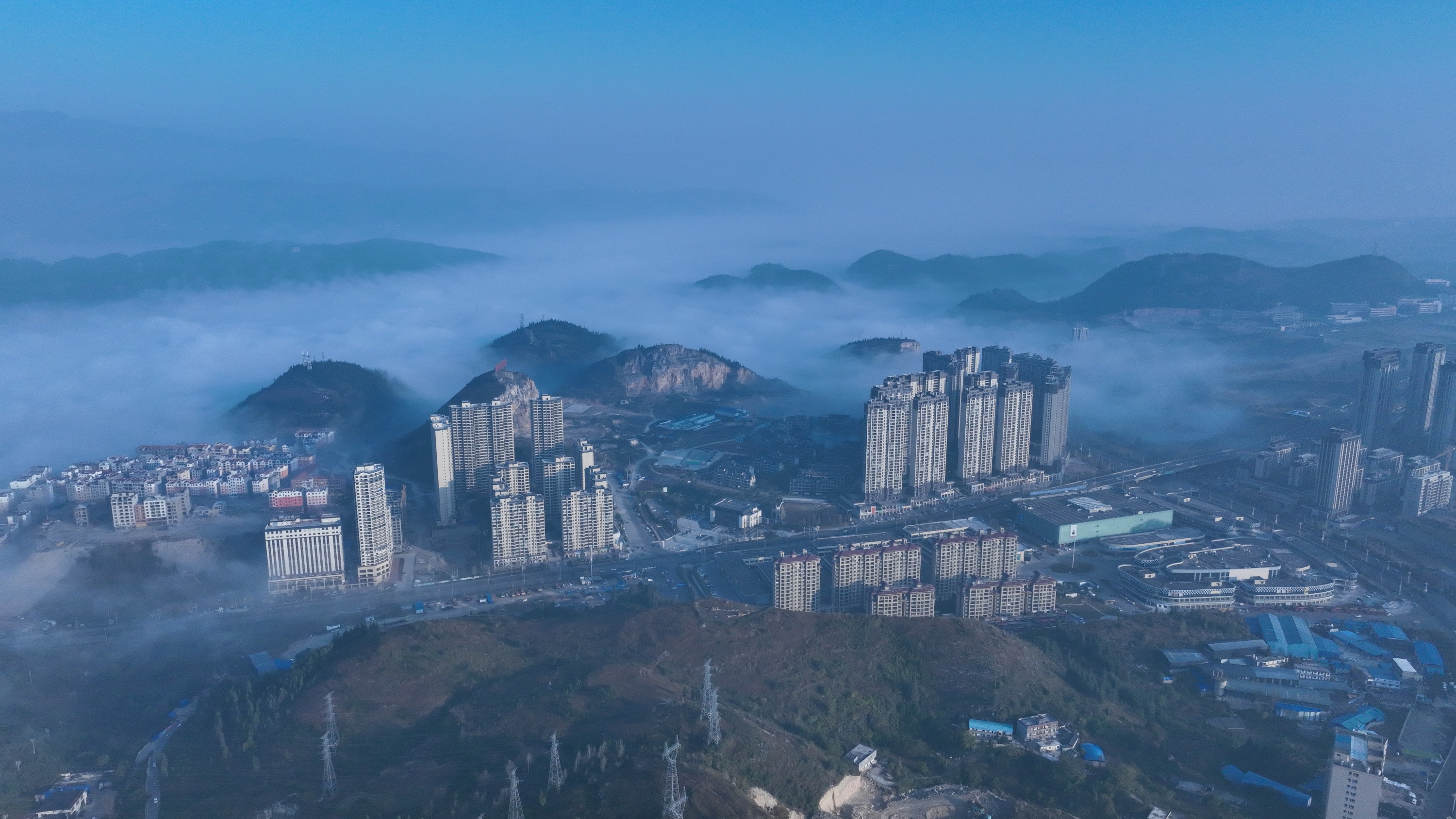 低矮的雾气又以月亮山为界,将城市分为清晰与朦胧。楼群也被按照高低有序分开,有的掩映其中,有的披上“白纱”。