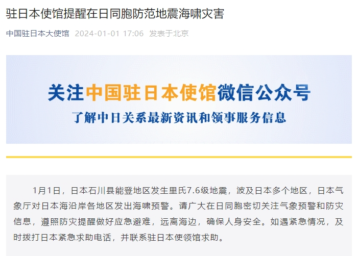 2024年1月1日,日本石川县能登地区发生里氏7.6级地震,波及日本多个地区,中国驻日本大使馆向广大在日同胞发出提醒,全文如下: