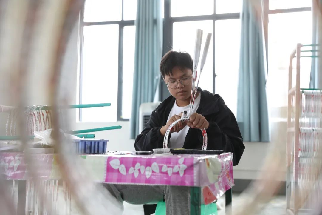 同样位于贵州锦屏经济开发区的贵州羽辉新材料科技有限公司羽毛球拍加工厂里,传来阵阵机械轰鸣声,拉条、木把定型、钻孔、喷漆……现场一派繁忙景象。