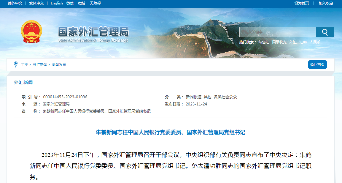 2023年11月24日下午,国家外汇管理局召开干部会议。中央组织部有关负责同志宣布了中央决定:朱鹤新同志任中国人民银行党委委员、国家外汇管理局党组书记。免去潘功胜同志的国家外汇管理局党组书记职务。