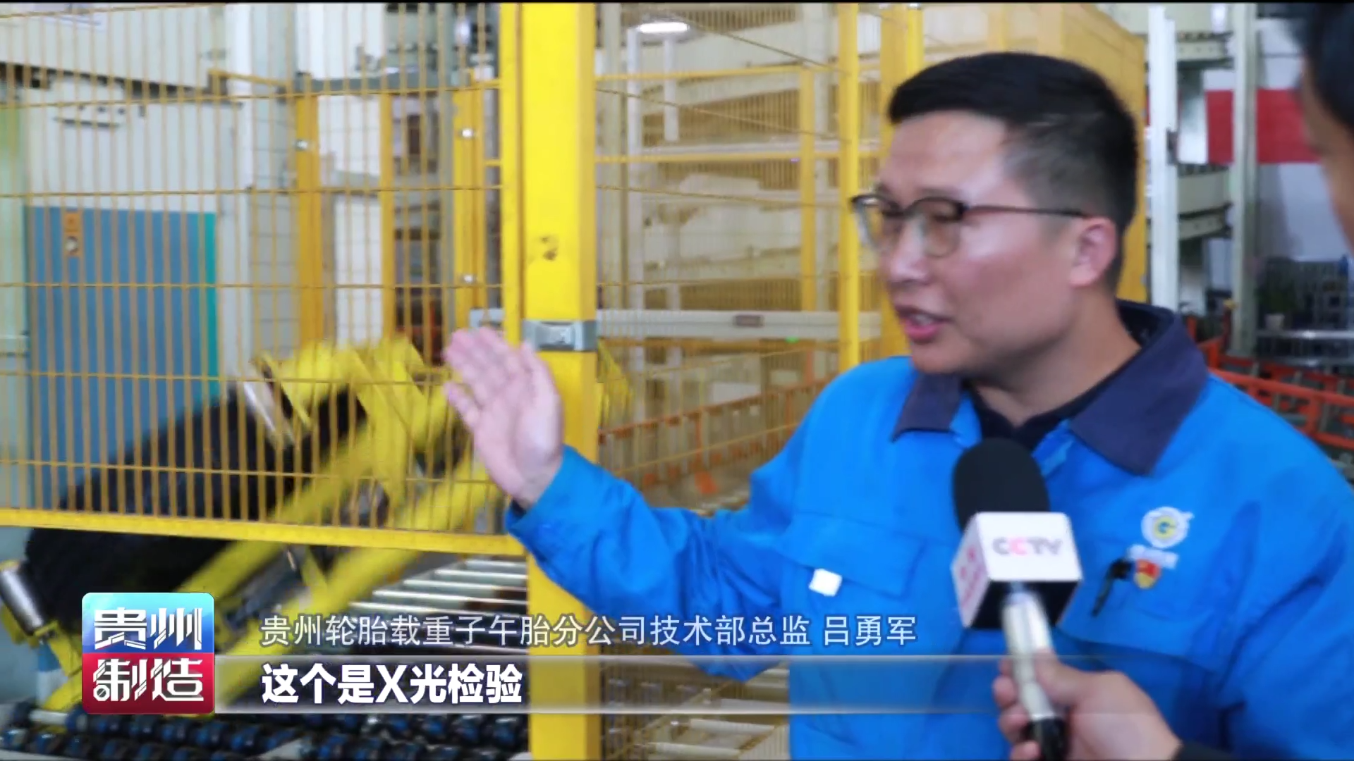 贵州轮胎载重子午胎分公司技术部总监吕勇军向记者介绍身旁的X光检验设备,主要是用于探测轮胎内部的一些缺陷,公司引进了AI自动判级系统,自动学习判断缺陷,现在效率提升了40%左右。
