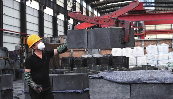 5月14日,工人在贵州岑巩经济开发区一家生产新能源材料的企业吊装石墨烯成品材料。新华社记者 杨楹 摄