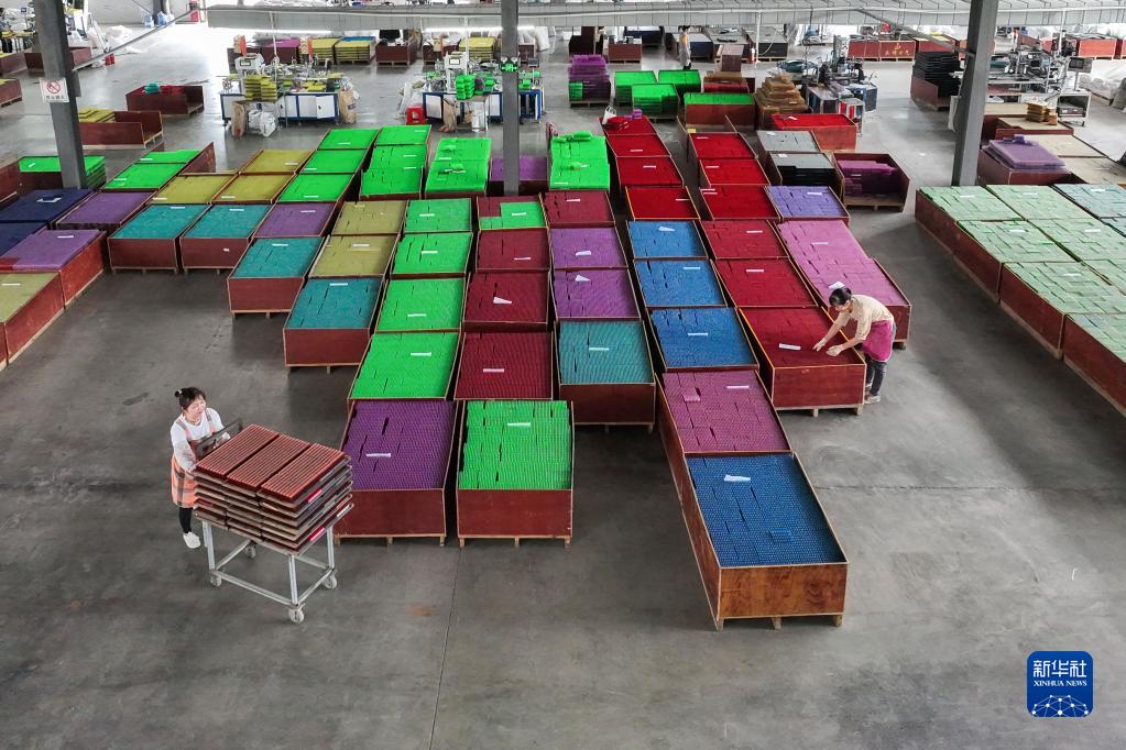 5月14日,工人在贵州岑巩经济开发区一家电气公司生产车间忙碌(无人机照片)。新华社发(罗慧 摄)