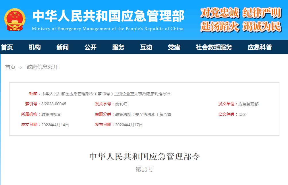 《工贸企业重大事故隐患判定标准》已经2023年3月20日应急管理部第7次部务会议审议通过,现予公布,自2023年5月15日起施行。