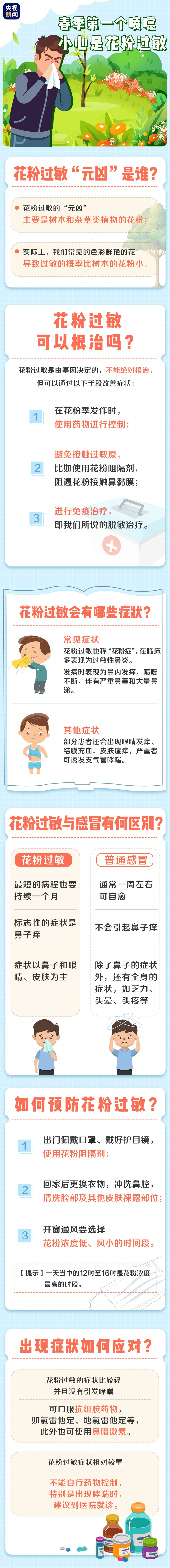 春回大地,百花盛开。随着春季到来,花粉等过敏原增多,可能给过敏性体质人群的出行和生活带来不便。那么,花粉过敏的“元凶”是谁?其症状与感冒有何区别?又该如何预防和应对呢?一图详解↓↓↓