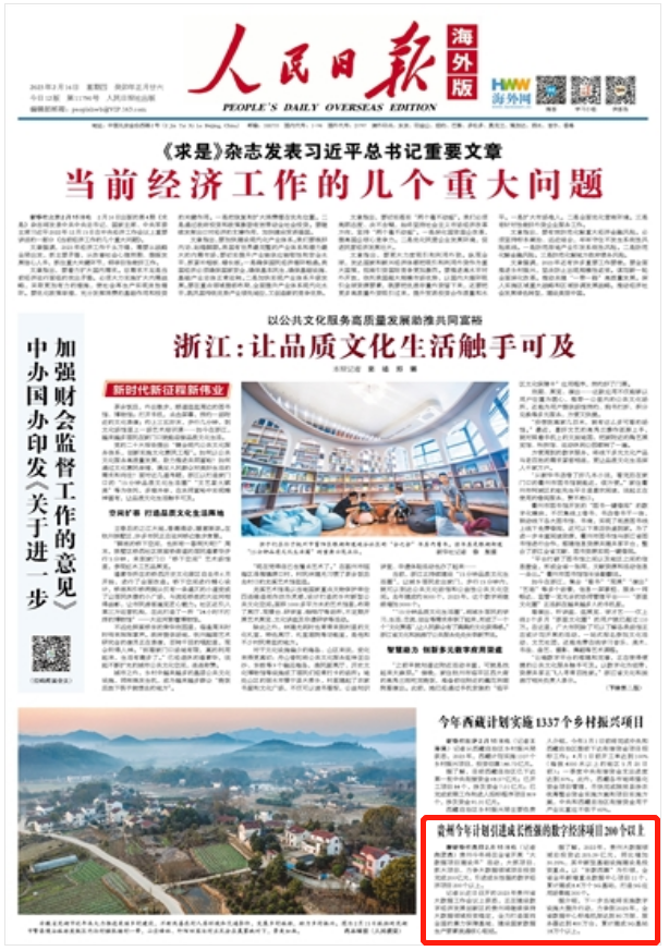 今天(2月16日),《人民日报海外版》刊发新闻《贵州今年计划引进成长性强的数字经济项目200个以上》。