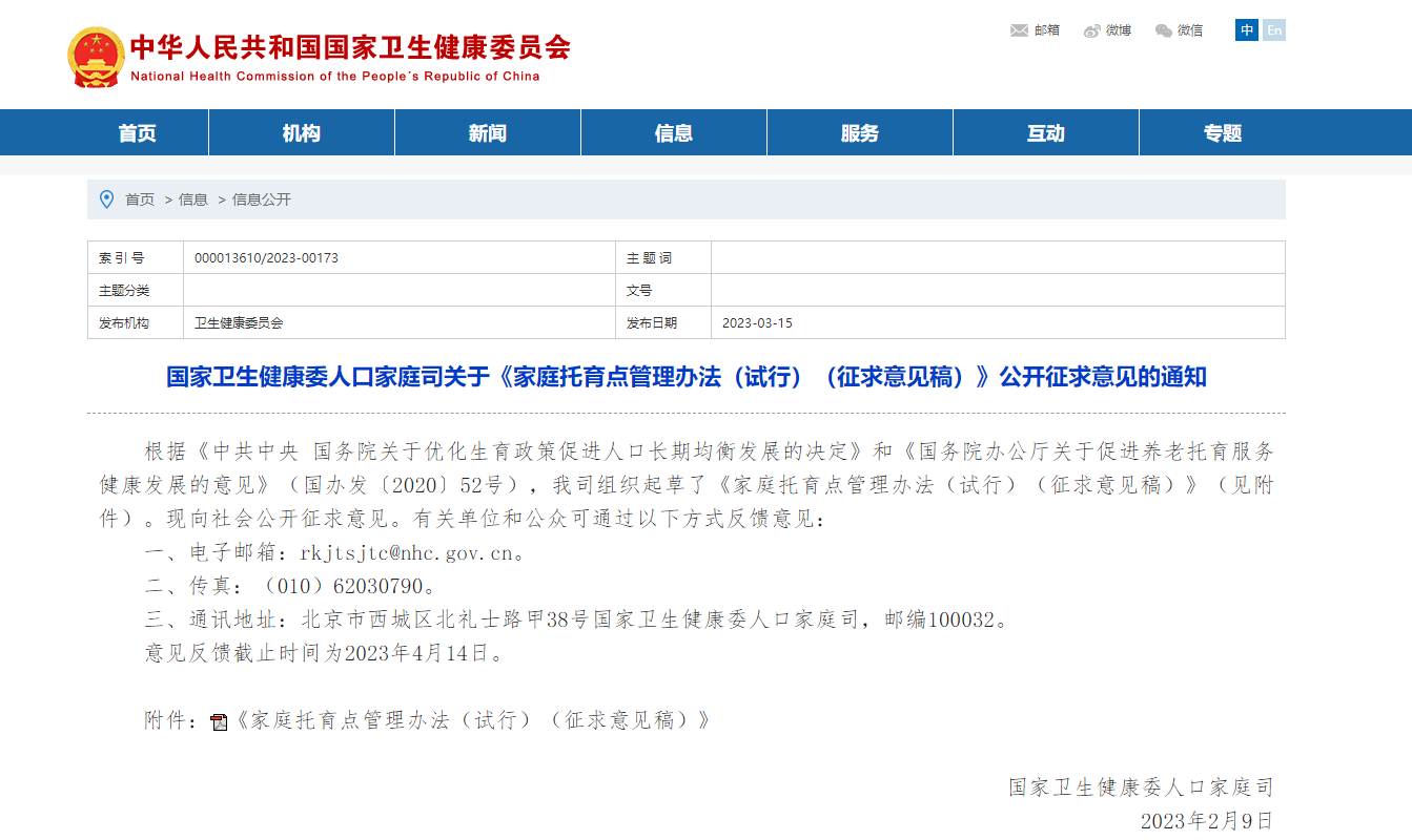 国家卫生健康委人口家庭司就《家庭托育点管理办法(试行)(征求意见稿)》公开征求意见。