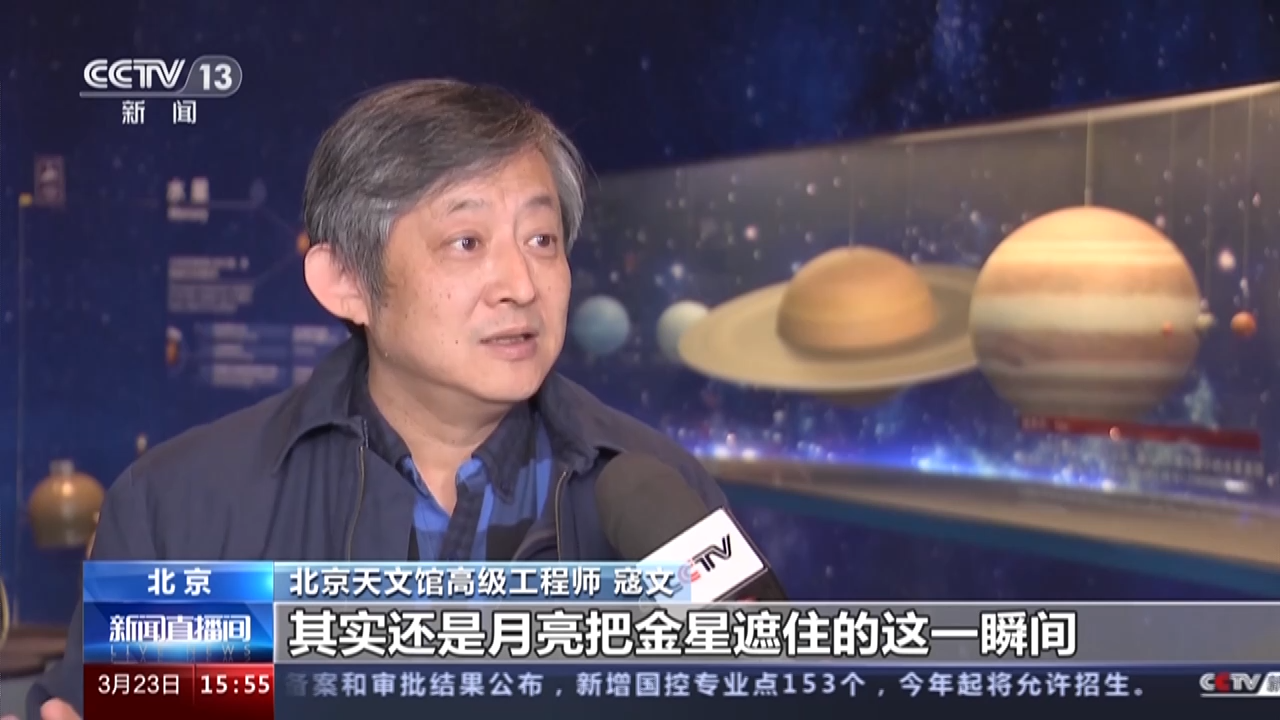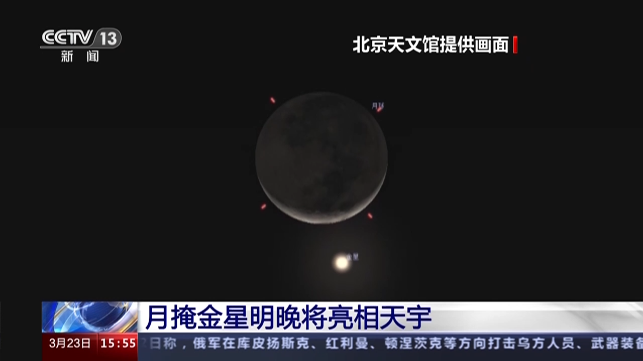 北京天文馆高级工程师 寇文:真正好看的能引起我们关注的其实还是月亮把金星遮住这一瞬间,因为初三的月亮它是一个弯弯的月牙,掩食开始的时候是从月亮的暗边开始,实际上你觉得月亮离金星还有一段距离,金星就开始消失了。平均大概是半分钟到一分钟,你会觉得金星越来越暗,慢慢熄灭,最后完全消失不见,它是一个过程。