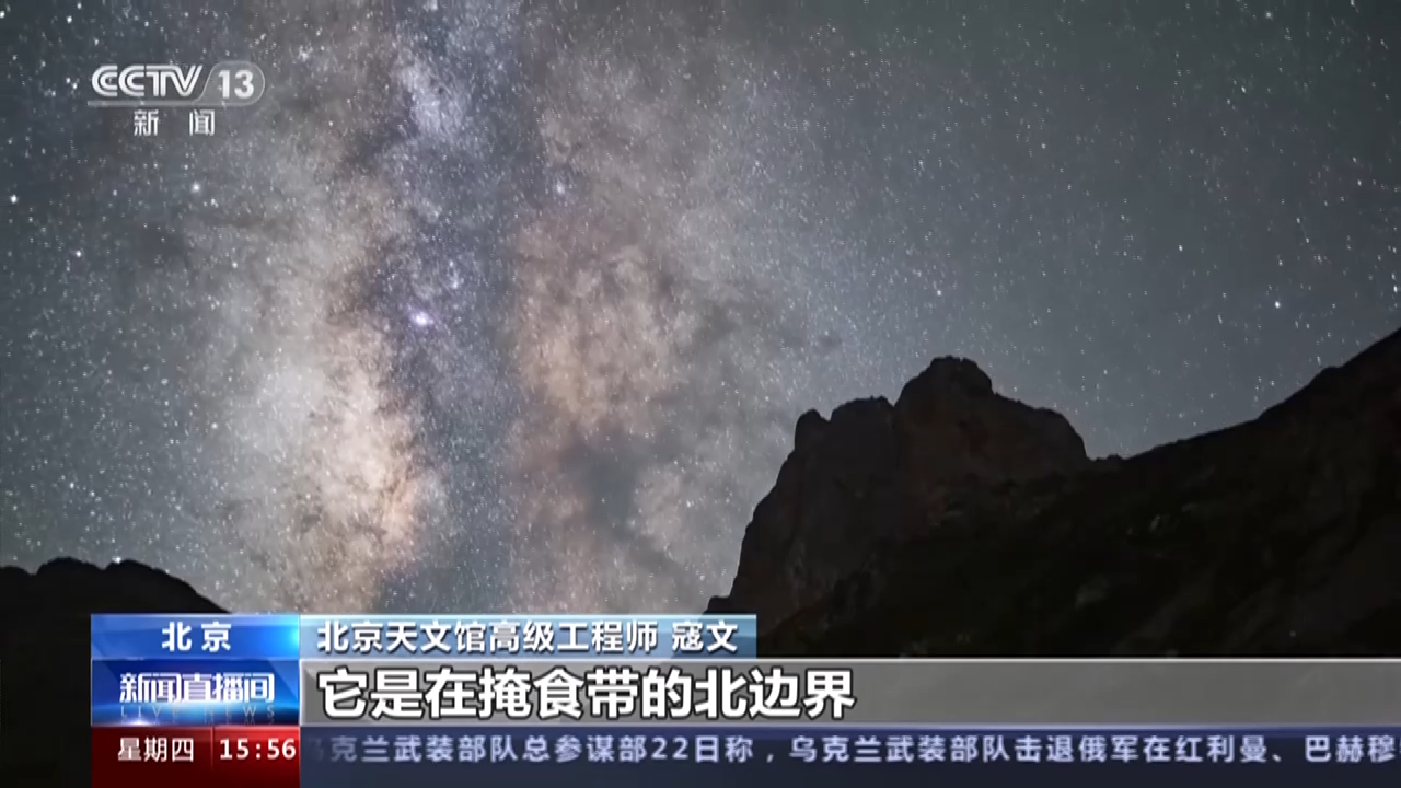 北京天文馆高级工程师 寇文:比如说像山西南部、河南北部、山东南部,它是在掩食带的北边界,这些地方它遮挡的时间比较短,它从月亮的一边进去,从一边很快就出来了,时间非常短。但是越往中国的南部地区走,它经过月面中心的距离越近,这样它穿过月亮的时间就会长。
