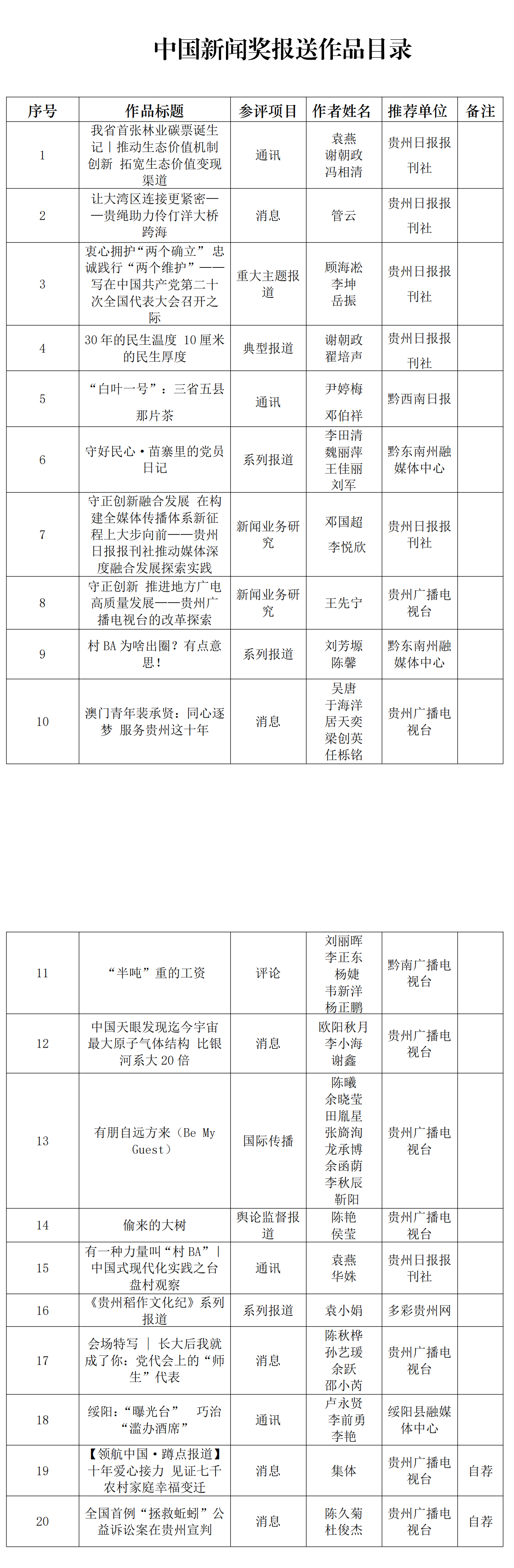 第三十八届(2022年度)贵州新闻奖评选会于2023年5月9日至11日在贵阳召开,经本届贵州新闻奖评选委员会审议评定,评出参评第33届中国新闻奖作品18件。此外,另有2件新闻作品以自荐方式申报。