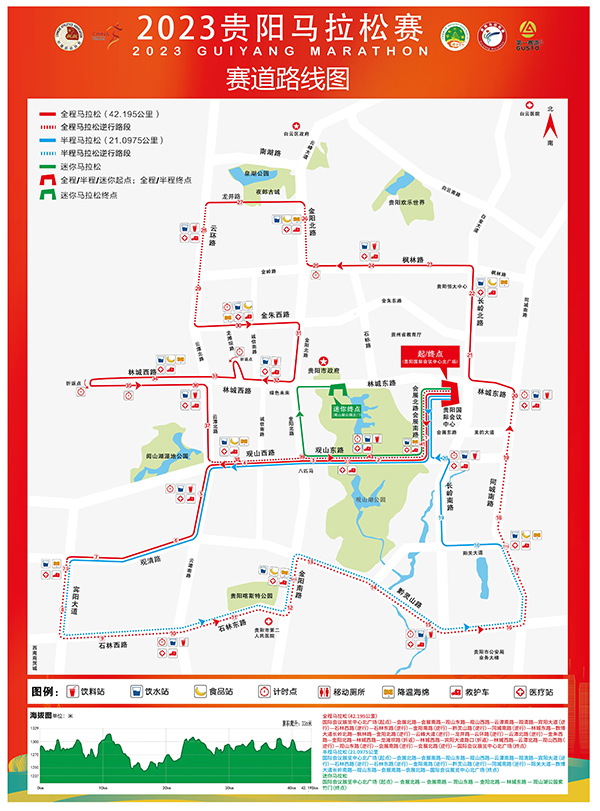 2023贵阳马拉松起点和马拉松、半程马拉松终点设置在贵阳国际会议展览中心北广场,这里西面毗邻观山湖公园,是连接城市与绿色生态景观带的重要节点,体现出贵阳建设生态文明城市的规划理念。