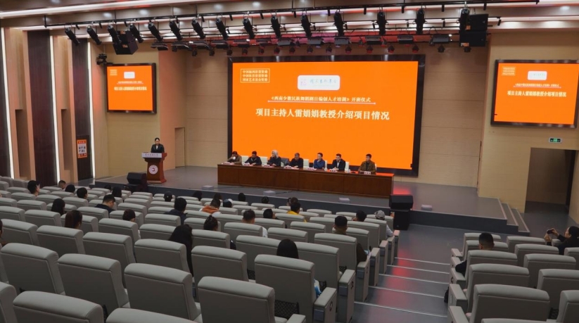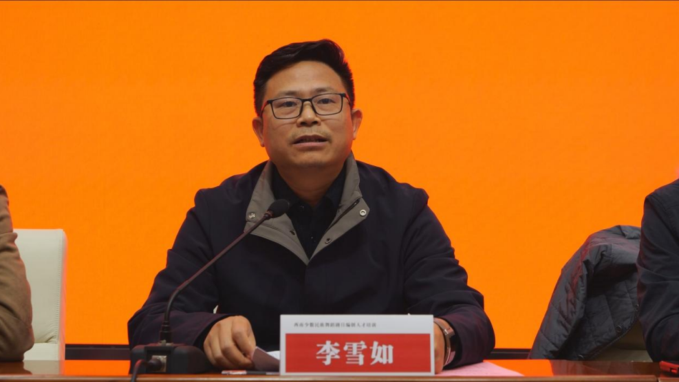 贵州民族大学党委常委、统战部部长、党政办主任李雪如代表学校致辞。 他强调《西南少数民族舞蹈剧目编创人才培养》采风创作面向贵州省、云南省、四川省、重庆直辖市,广西壮族自治区、西藏藏族自治区西南六省,地域宽、任务重、时间紧。为优质高效完成项目培训,项目团队要深入学习贯彻习近平文化思想,深入贯彻习近平总书记在贵州考察时的重要讲话精神。作为项目主体的贵州民族大学,严格按照国家艺术基金的要求,多措并举,抓出实效。一是学校将加强对项目实施的领导与支持、督导与检查,学校各科室、学院及项目负责人,要发扬团结鼓劲、争创第一的精神,将项目实施好,探索出项目实施成功的有益经验可学可借鉴,不断开创新时代贵州民族大学项目争取与实施的工作新局面;二是为项目培训提供优质服务,聘请国内艺术领域知名学者与高校专家及活跃在地方的非遗传承人为学员授课和训练指导,组织学员深入少数民族村寨进行采风研习,感受传统民俗文化、体验民俗生活,既要保持西南少数民族艺术的“真实性”和“整体性”,又要兼具“训练性”和“系统性”,努力提升西南少数民族舞蹈作品的原创性、艺术性和制作水平,着力创作精品,不断增强西南少数民族舞蹈艺术的影响力、辐射力;三是为西南各少数民族文化的交流与合作搭建平台,培养一批具有艺术探索精神,服务人民精神文化需求的新时代西南少数民族舞蹈剧目编创人才,繁荣西南少数民族舞蹈表演与创作,为弘扬中华优秀传统文化,实现中华优秀传统文化振兴作出新贡献。