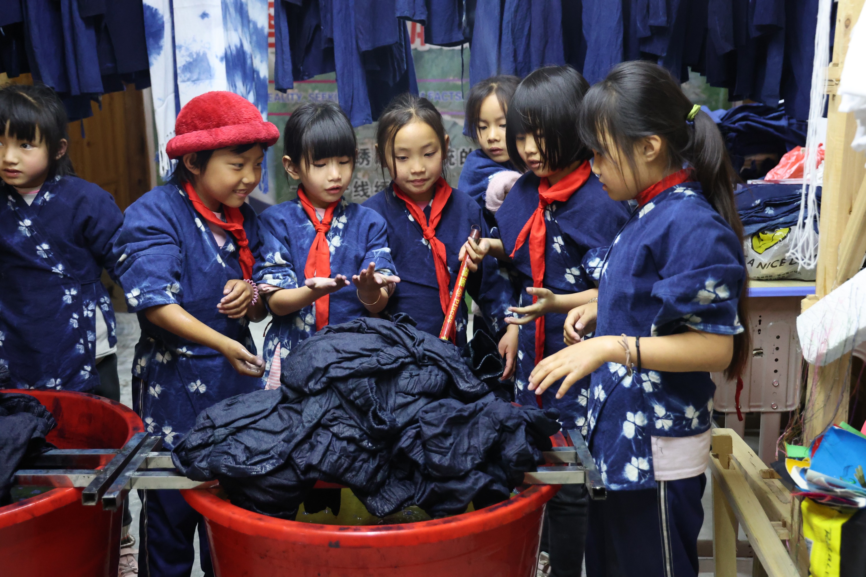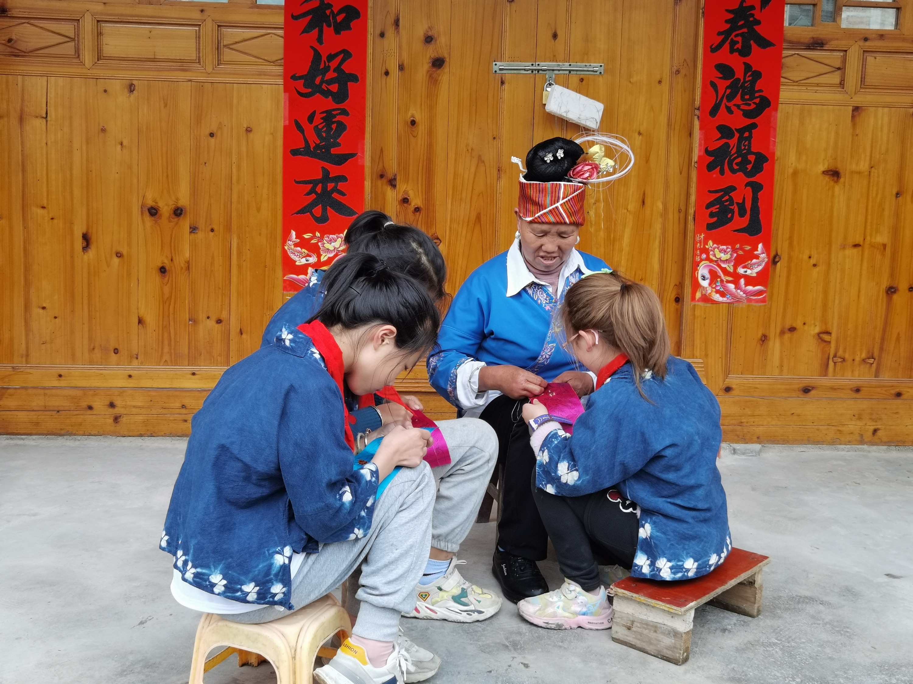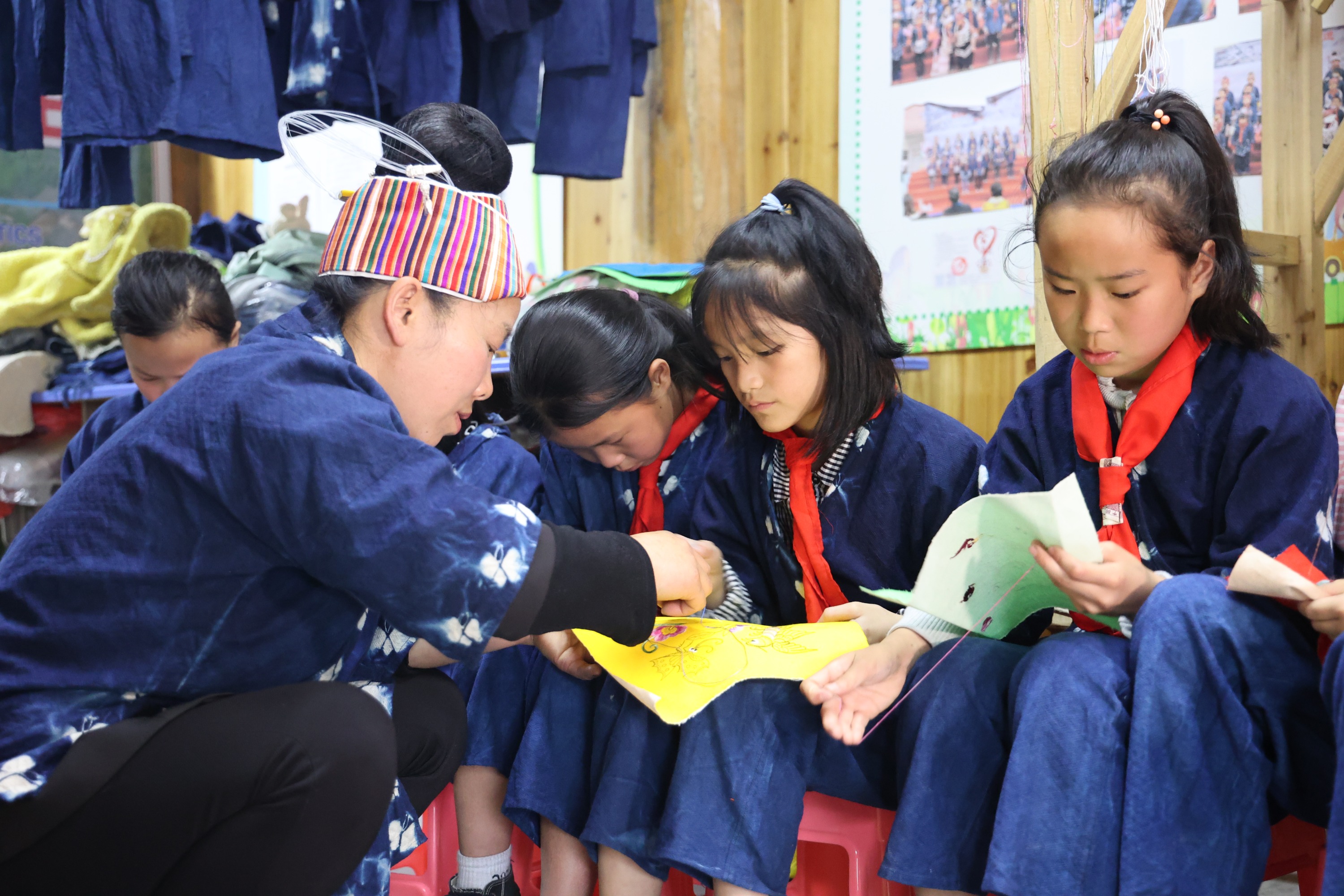 除了学习蓝靛染布,孩子们还会学习刺绣,他们会在学校里同万老师学,也会在周末回家后同奶奶学。自己民族的文化,就这样穿梭在他们手中,一针一线,一剪一裁,一染一晒,印刻在他们成长的路上。来自六年级的潘雨秋晨告诉记者,通过制作民族手工拿去卖,他们还领到了新被单、新学些用品,这让他们很有成就感,原来其他人也这么喜欢自己民族的东西。