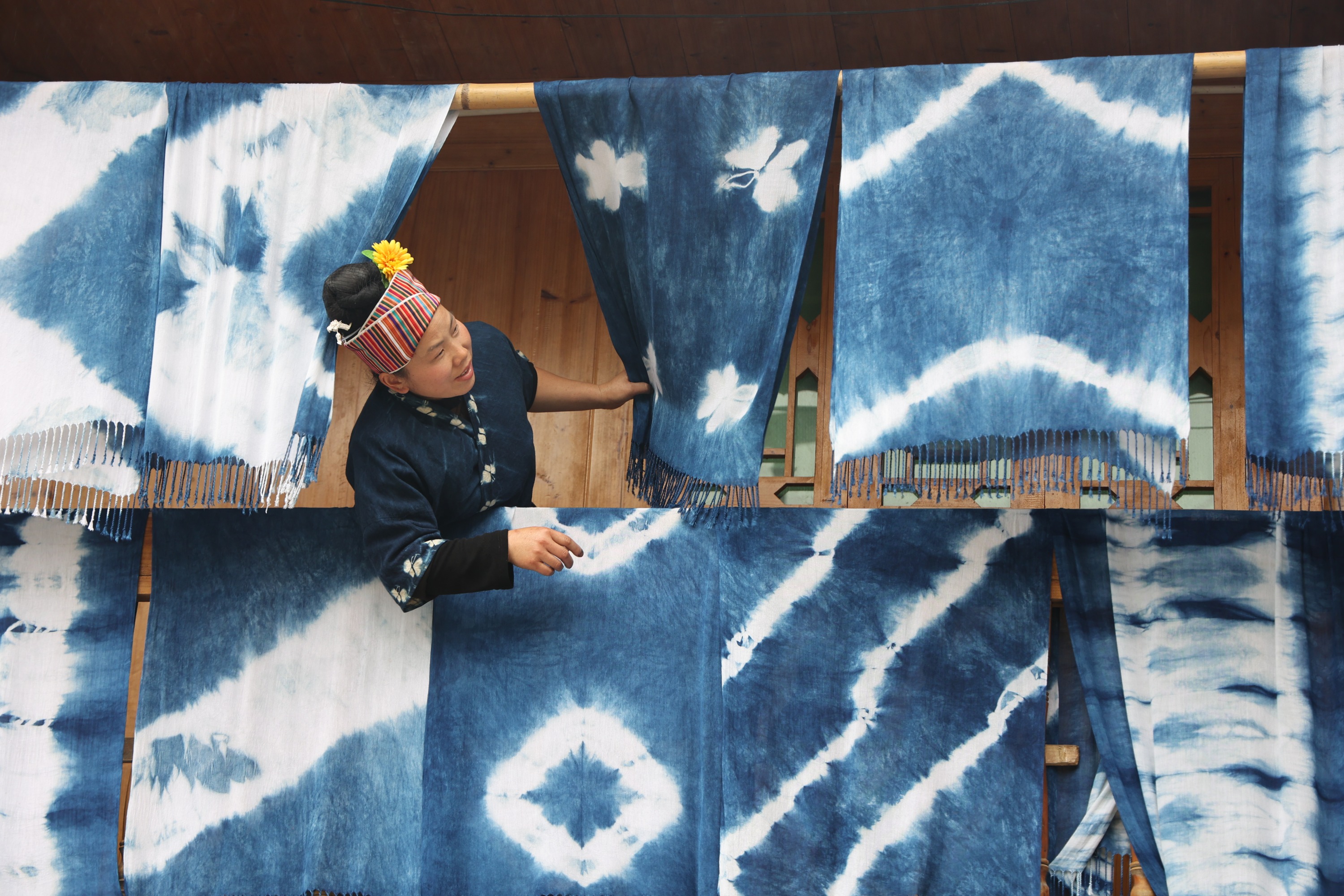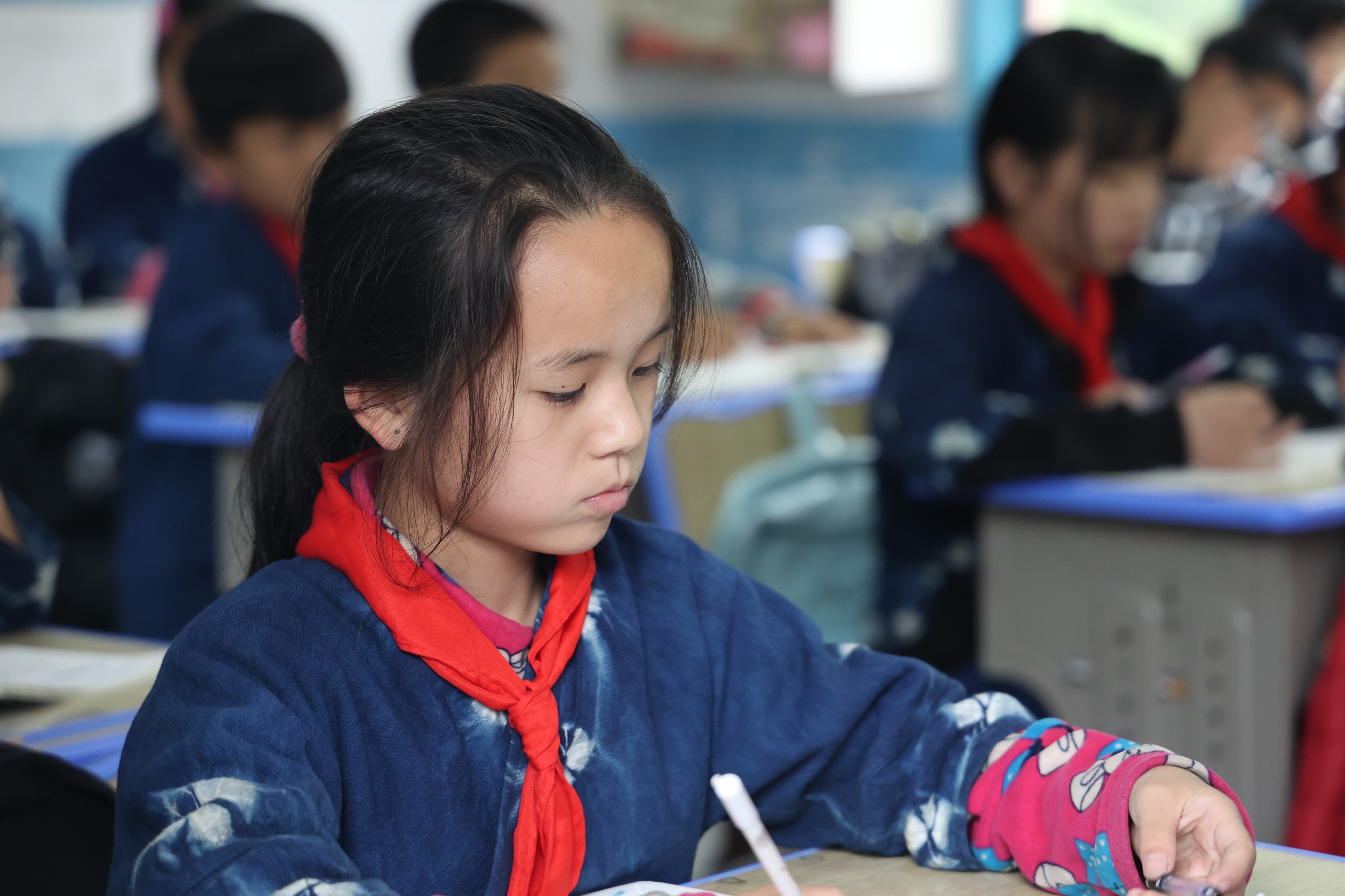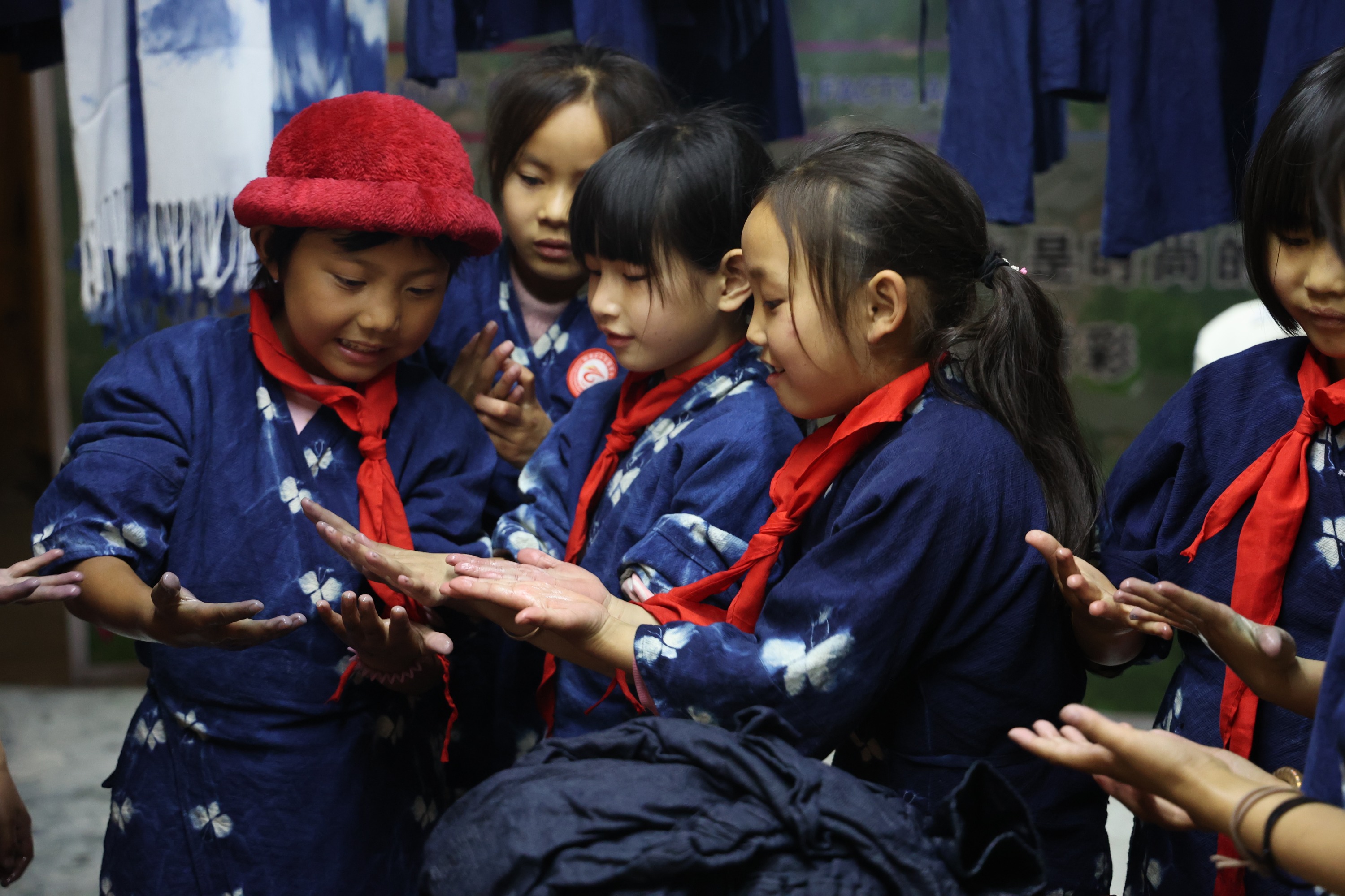 除了学习蓝靛染布,孩子们还会学习刺绣,他们会在学校里同万老师学,也会在周末回家后同奶奶学。自己民族的文化,就这样穿梭在他们手中,一针一线,一剪一裁,一染一晒,印刻在他们成长的路上。来自六年级的潘雨秋晨告诉记者,通过制作民族手工拿去卖,他们还领到了新被单、新学些用品,这让他们很有成就感,原来其他人也这么喜欢自己民族的东西。
