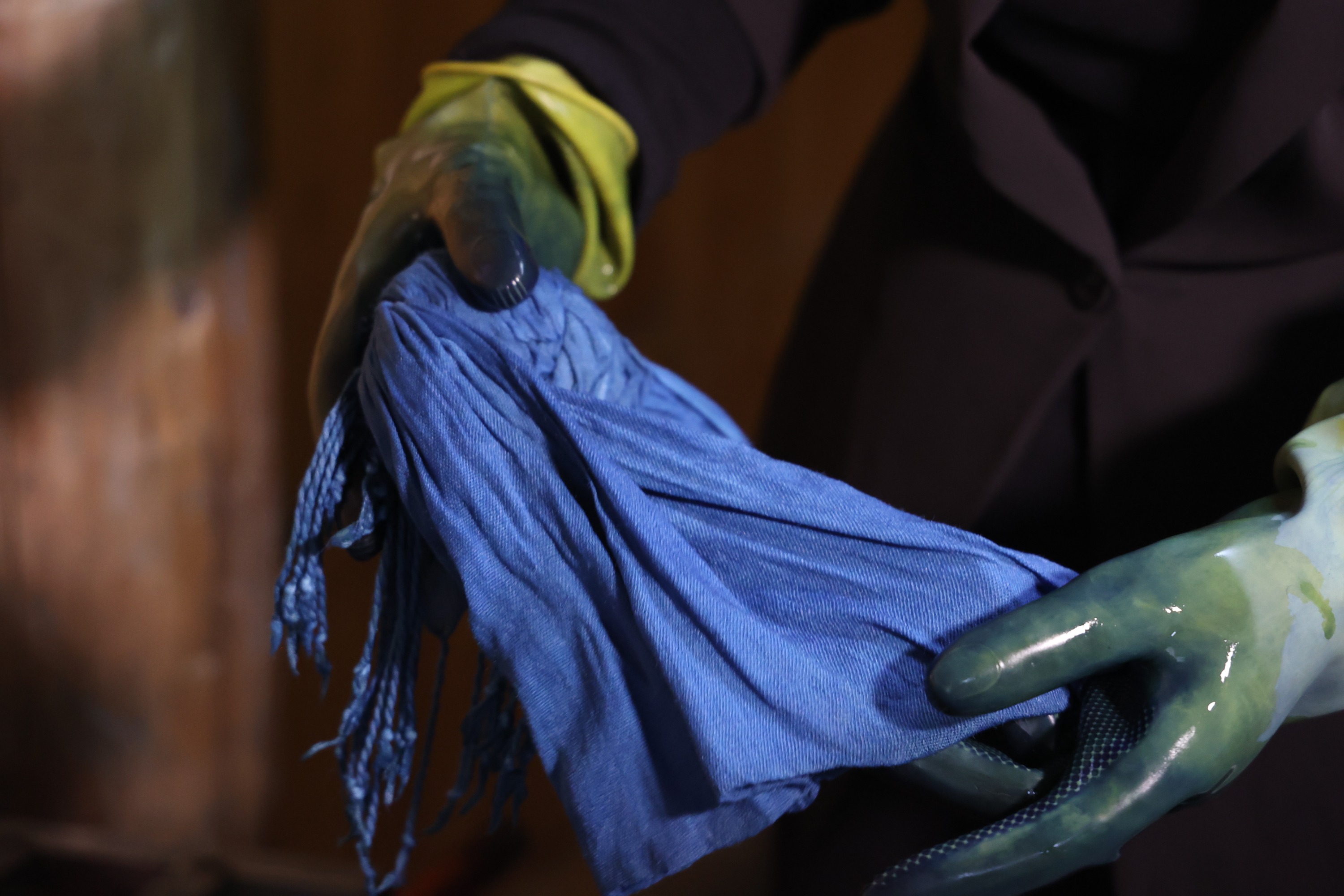 除此,孩子们的菜地中还种有一种特殊植物,用来制作染料,由学校民族课老师万秀英负责制成,万秀英老师介绍说,染料是有生命的,“活”染料呈青黄色,“死”染料呈黑蓝色且散发着臭味,即使是染缸里的“活”染料也需要每天护理,也就是不定期注入新鲜染料,否则它一样会变成“死”染料。也唯有“活”染料才能上色。