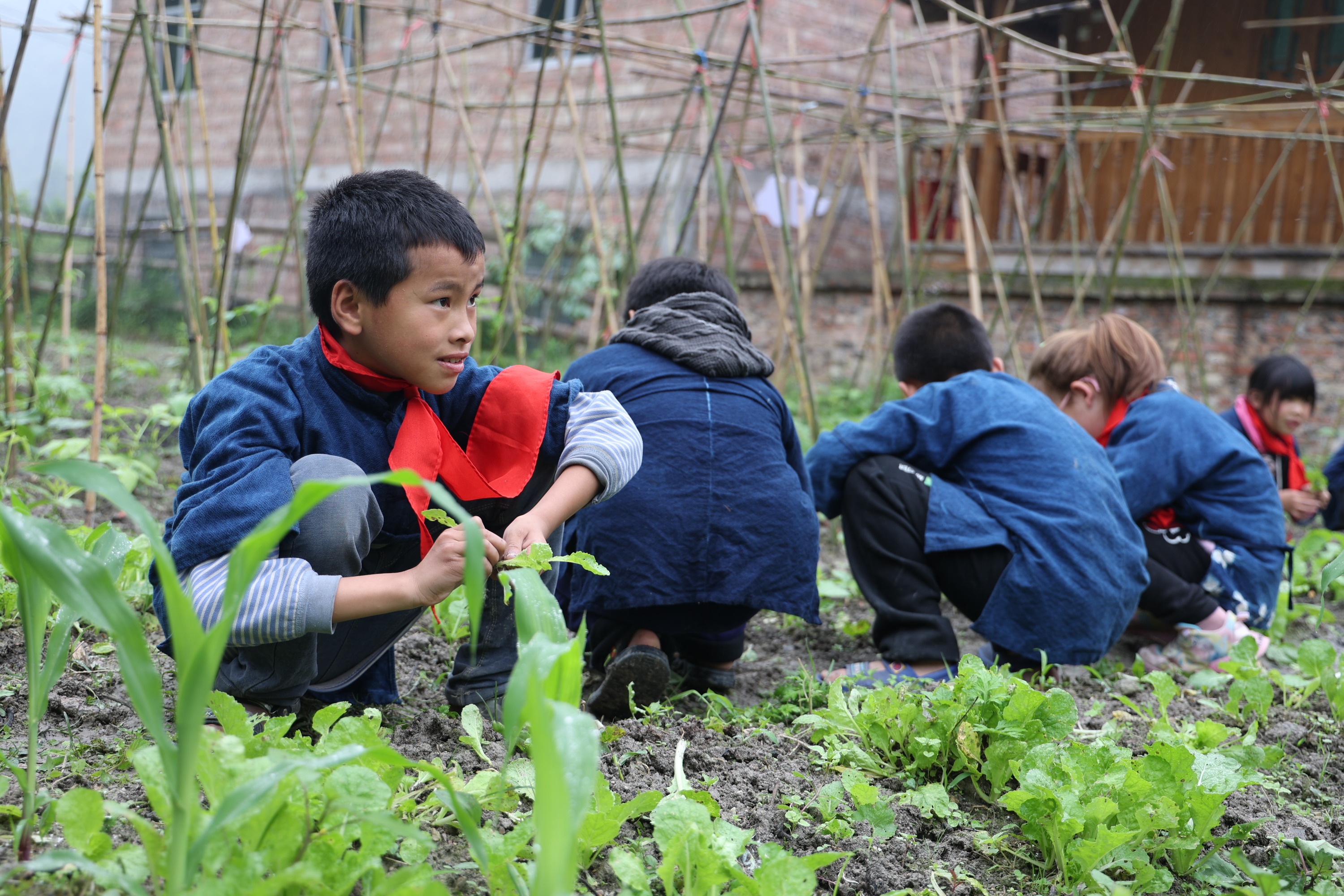 由于远离城区,配送来的蔬菜经过长途颠簸,总是丧失了最初的“新鲜”,所以学校开始带领学生们自己种菜。学校菜地就位于教学楼后面,一畦畦蔬菜瓜豆,就像成长中的孩子,每一块地的前方还竖有标牌,从一年级排到六年级,菜地名字分别叫“成长院”、“起航港”、“追梦园”、“彩虹圃”、“芳馨菜园”、“致远菜园”。