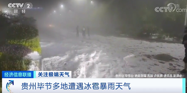 暴雨冰雹还出现在贵州毕节,22日晚上11点左右,毕节部分县区遭遇短时冰雹袭击,路面上铺满一层白色的冰雹粒,随处可见被打落的树叶。