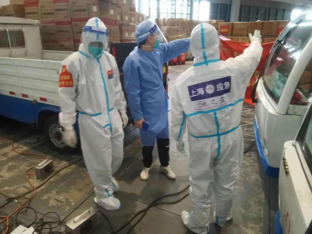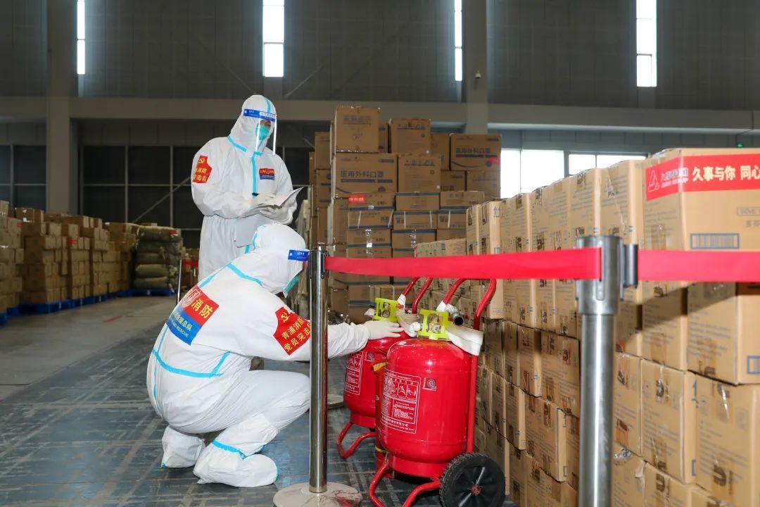 上海消防救援人员正对方舱医院物资仓库新增配的消防产品进行检查。