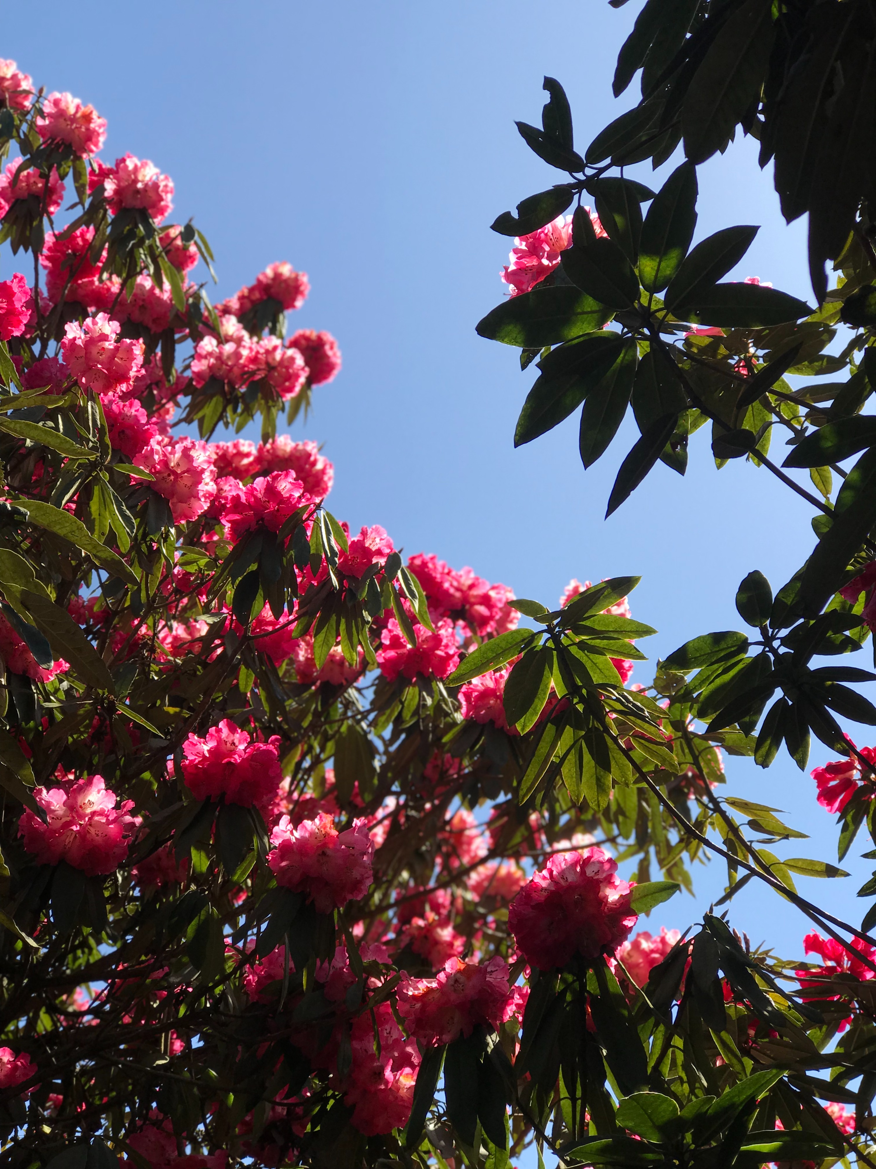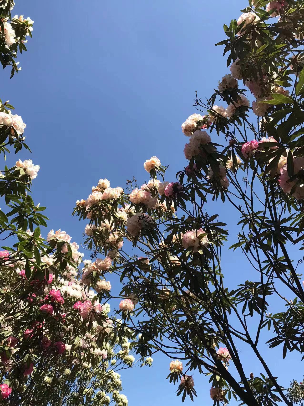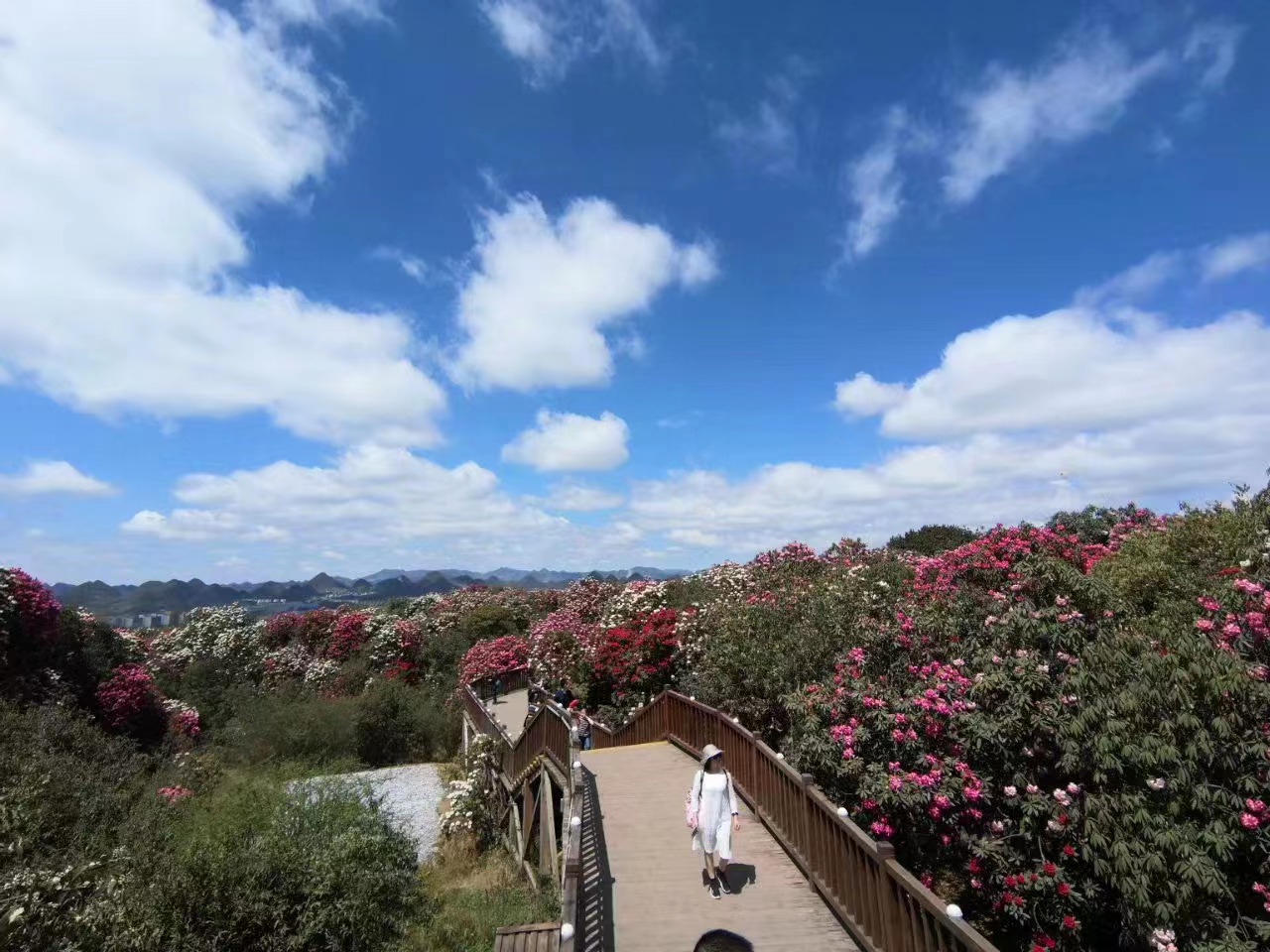 盛开如彩带,百里杜鹃花。盛开的百里杜鹃是彩色的,看花的人眼里也是彩色的,心里也就跟着是斑斓的。