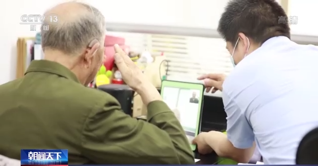 为了久别重逢的见面,卢玉佩老人专门穿上整齐的军装。由于他的听力功能严重下降,社区工作人员专门为他准备了音箱。
