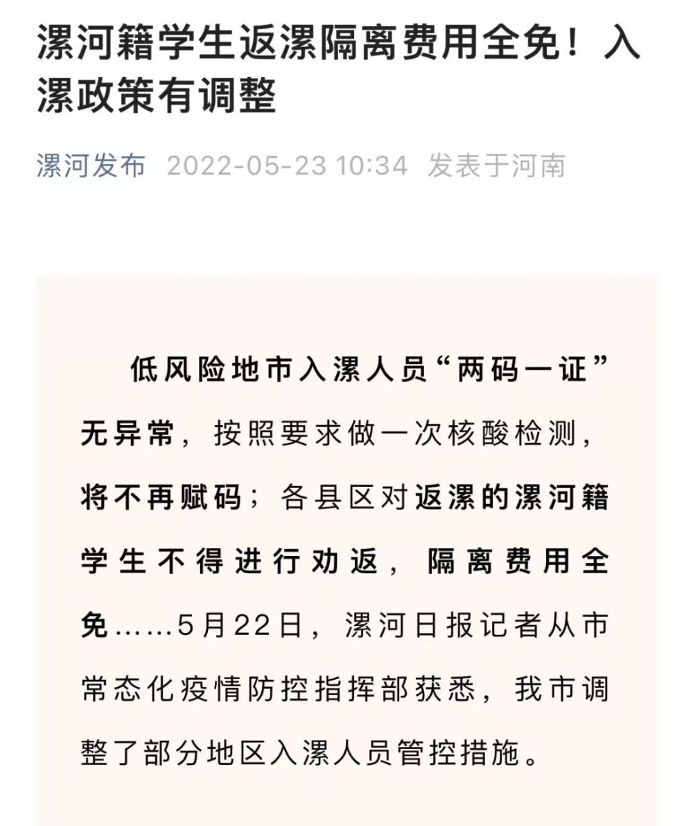 河南漯河:对自外地市返漯的漯河籍学生,提前三天报备,不得进行劝返,返漯后如符合集中隔离条件,凭有效学生证件,实行免费集中隔离和转运。此前返漯隔离学生已缴费者,全额退还。