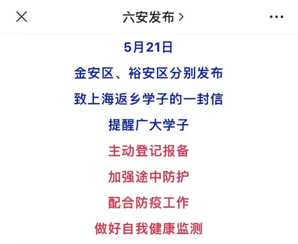 安徽六安金安区、裕安区:5月21日,金安区、裕安区分别发布致上海返乡学子的一封信。其中均提到,返乡后主动配合“7+7”管控措施,即7天集中隔离,7天居家健康监测(主动提前报备的返乡学子,集中隔离期间不收取任何费用)。