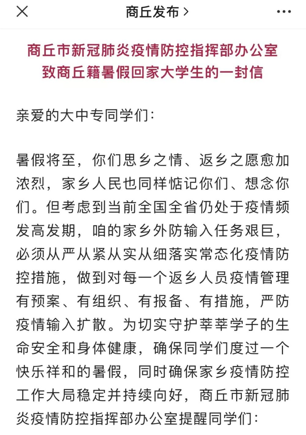河南商丘:对于由北京、上海全域、郑州中心城区和天津、四川广安等中高风险地区或近14日内有疫情社区传播和外溢风险的地区返乡大学生,入商时严格落实点对点闭环转运,实施7天集中隔离医学观察+7天居家健康监测(7天隔离期间要落实第1天、第4天、第7天三次核酸检测。其中,第7天实行双采双检,阴性后方可居家健康监测)。对于提前报备的大学生,7天集中隔离免费。