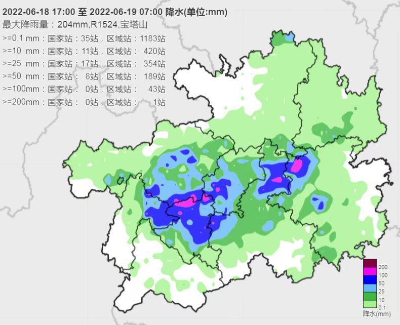 据省气象台消息,6月18日17时至19日07时,出现特大暴雨1站:清镇市宝塔山204毫米,大暴雨出现在清镇、水城、六枝、织金、黔西、西秀、普定、平坝、紫云、长顺、福泉、贵定、施秉 、黄平、雷山15县域内43个观测站,暴雨出现在29县域内197个观测站,大雨有370个观测站。强降雨主要在六盘水市东部、毕节市中南部、安顺市中北部、贵阳市中西部、 黔南州北部、黔东南州西部。有30个观测站雨强≥50毫米/小时,西秀药寨87.7毫米/小时最大(23时至00时)。