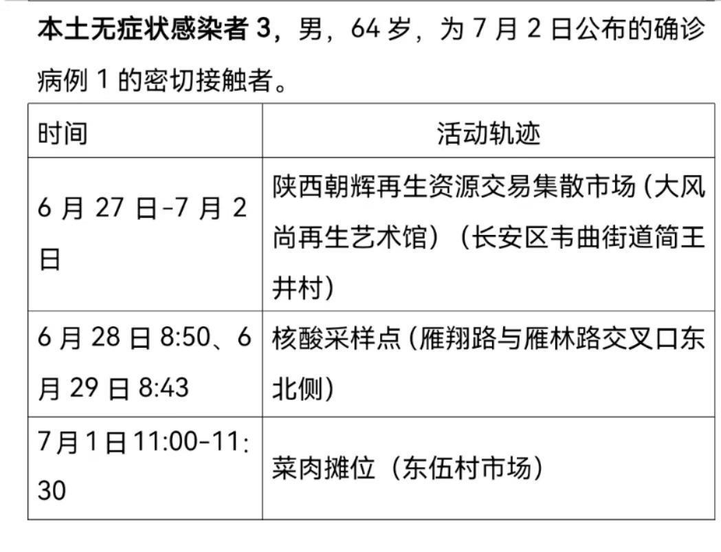 7月2日18—24时,西安新增2例本土确诊病例(普通型1例,轻型1例),3例本土无症状感染者,均在密切接触者筛查中发现。主要活动轨迹如下: