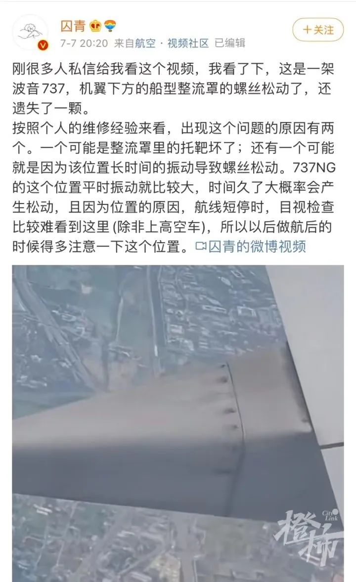 这是一架波音737,机翼下方的船型整流罩的螺丝松动了,还遗失了一颗。按照个人的维修经验来看,出现这个问题的原因有两个。一个可能是整流罩里的托靶坏了;还有一个可能就是因为该位置长时间的振动导致螺丝松动。737NG的这个位置平时振动就比较大,时间久了大概率会产生松动,且因为位置的原因,航线短停时,目视检查比较难看到这里(除非上高空车),所以以后做航后的时候得多注意一下这个位置。