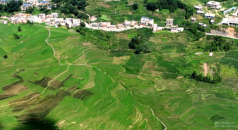 “万亩梯田”是新民镇打造的集种植和观光为一体的粮食仓库,时下,正是梯田里水稻生长旺盛的季节,依山分布的梯田内,阳光下,一望无际的水稻似一张巨大绿毯,在微风中荡起阵阵叶浪,成为独特一景。